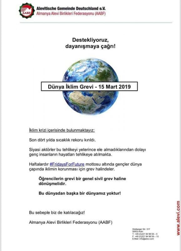 Almanya Alevi Birlikleri Federasyonu (AABF) komuoyuna yaptığı yazılı bir açıklmayla, ‘Dünya İklim Grevi’ni destekleyeceğini açıkladı.