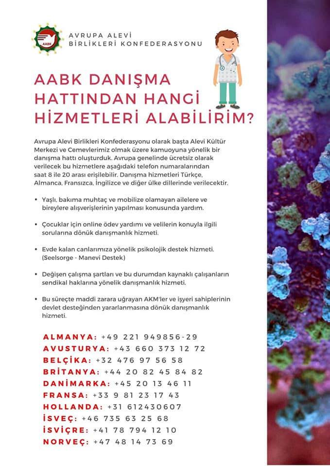 Avrupa genelinde sokağa çıkma yasağının ilan edilmesinin tartışıldığı bir süreçte, Avrupa’daki Alevilerin örgütlü birlik çatısı olan Avrupa Alevi Birlikleri Konfederasyonu’da, Avrupa çapında Corona virüsüyle mücadeleye omuz vermek için toplumsal danışma hatları açtı. Toplumun her kesiminden insanın ücretsiz yararlanabileceği bu hatlarda, alışveriş yardımı, eğitim, hukuk ve manevî destek konularında hizmet alınabilecek.