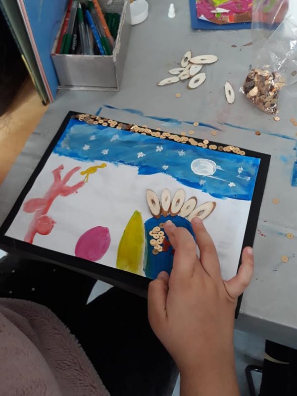 Akrilik boya her zaman çocukların daha rahatlatıcı çalışmasını sağlıyor. Pastel ile de olur, daha küçükler için parmak boya da… Fakat azcık büyüyünce akrilikin keyfini almalılar.