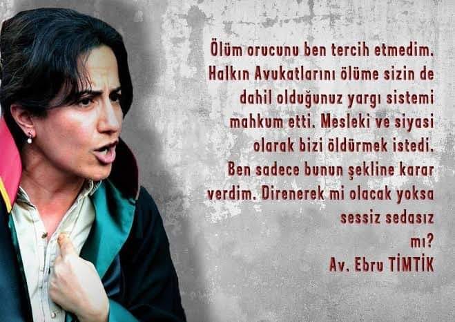 Son söz olarak aynu Ebru Timtik gibi bedenini 238 gündür ölüm orucuna yatıran Aytaç Ünsal’ın sözüyle bitirmek en doğrusu. ‘Hakkını isteyen, adalet isteyen bir avukatı göz göre göre öldürdüler ama sen şimdi halkın yüreğinde doğuyorsun.