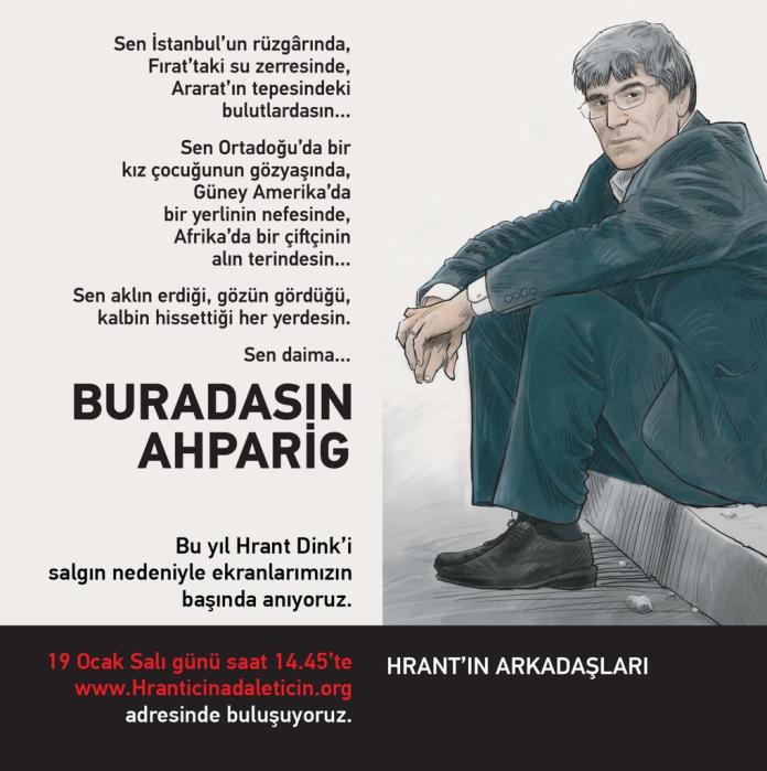 Gazeteci Hrant Dink katledilişinin 14. yıldönümünde, 19 Ocak’ta anılacak. Her yıl gazetesi Agos önünde yapılan anma töreni bu yıl salgın nedeniyle sanal ortamda gerçekleşecek. Dünyanın her yerinden Hrant’ın Arkadaşları, 19 Ocak Salı günü saat 14.45’te www.hranticinadaleticin.org adresinde buluşacaklar ve sembolik olarak “Buradasın Ahparig” yazan pankartlarını Hrant Dink’in öldürüldüğü yere bırakacaklar.