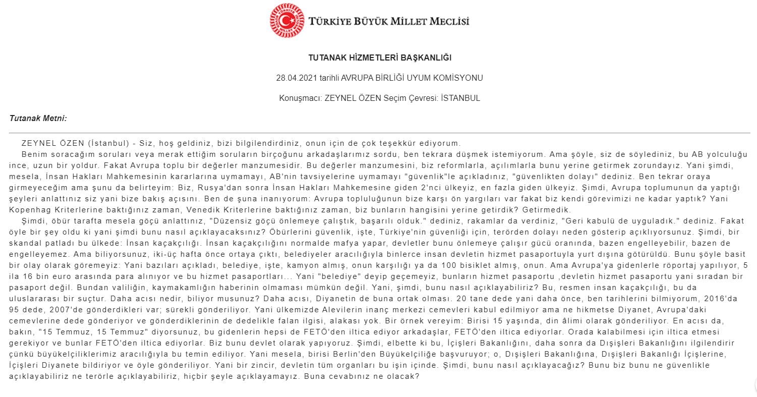 HDP İstanbul Milletvekili Zeyene Özen, Avrupa Birliği Uyum Komisyonu bilgilendirme toplantıısnda Dışişleri Bakan Yardımcısı ve AB BaşkanıFaruk Kaymakçı’ya AKP belediyeleri ve diyanet eliyle Avrupa’ya yapılan insan kaçakcılığını sordu. Özen, AB Başkanı Faruk Kaymakçı’ya Diyanetin bir grupa gri pasaportlu dedeyi özellikle Alevilerin Muharrem ve Hızır orucu tutukları dönemlerde, Avrupa’daki Alevilerin cemevlerine gönderdiğinden haberi olup olmadığını sordu.