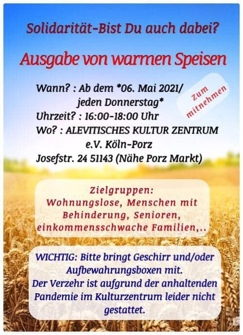 Sıçak yemek dağıtımı 6 Mayıs 2021 tarihinde başlayacak. Bu tarihten itibaren her Perşembe günü, Saat 16.00 -18.00 arasında kendi tabak ve kablarıyla birlikte Porz AKM‘ye gelen ihtiyaç sahibi insanlara sıcak yemek verilecek.
