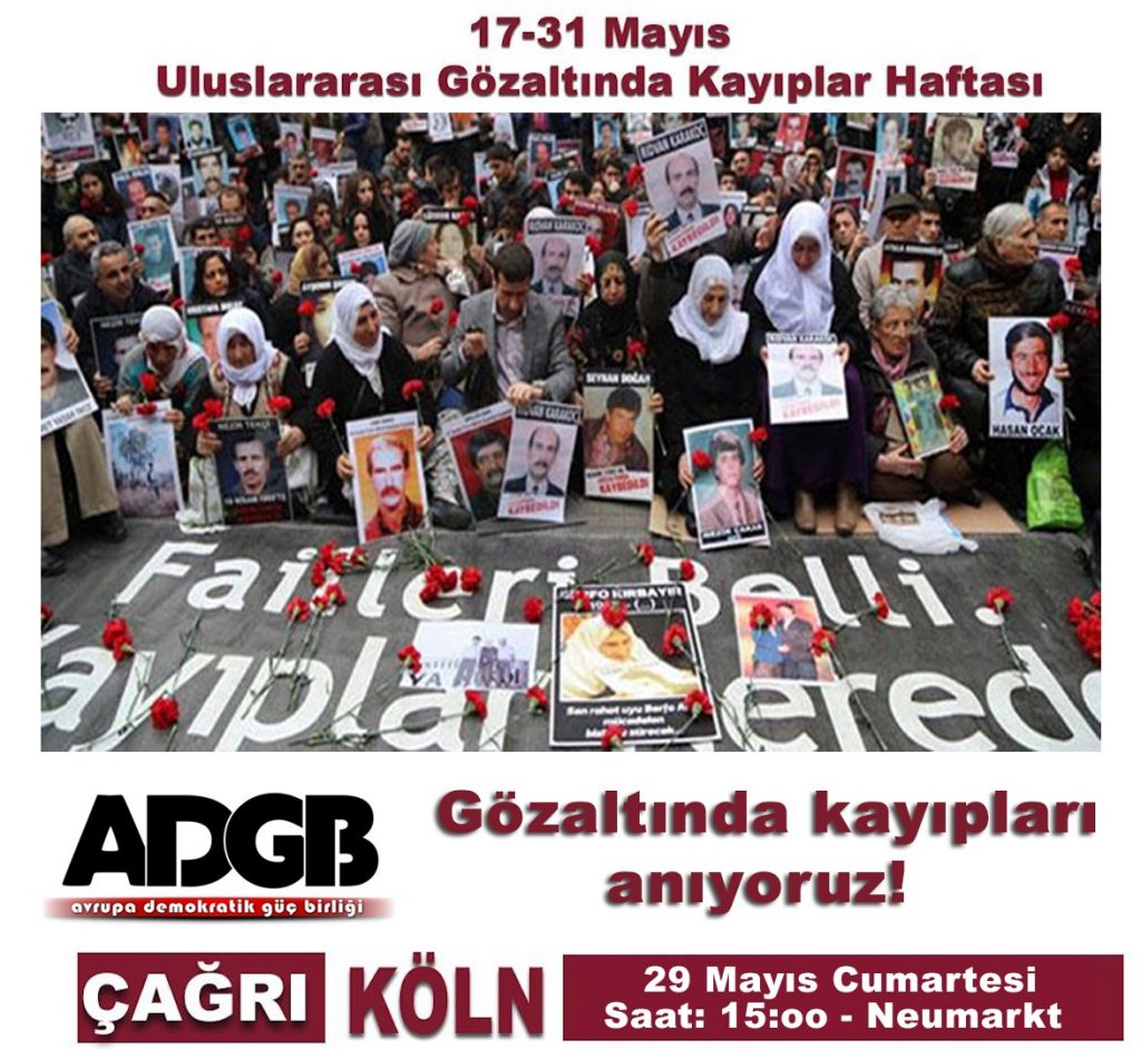 Bu anma etkinlikleri kapsamında, gözaltında kaybedilenler Almanya’nın Köln kentinde de anılacak. Avrupa Demokratik Güç Birliğ ( ADGB) Almanya bileşenlerinin, ‘‘17-31 Mayıs Uluslararası Gözaltında Kayıplara Karşı Mücadele Haftası‘‘ kapsamında, 29 Maysı Cumartesi gün Köln‘deki Neumarkt meydanında düzenleyecekleri anma, Saat: 15:00’de başlayacak.