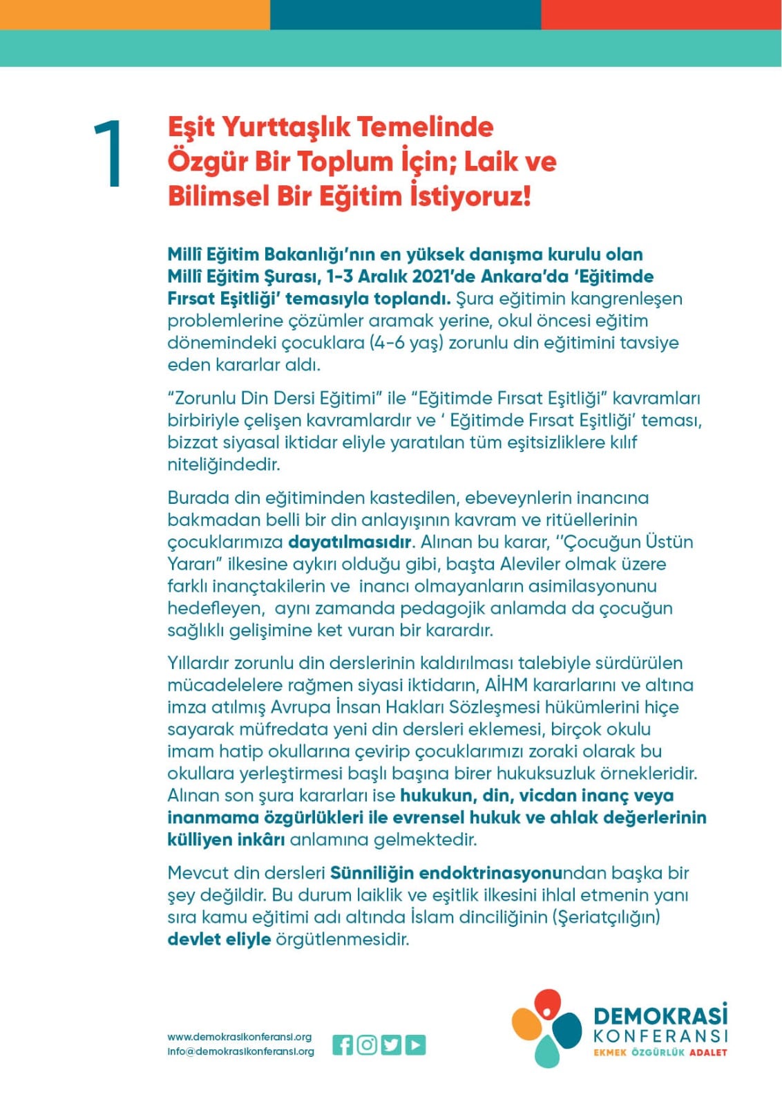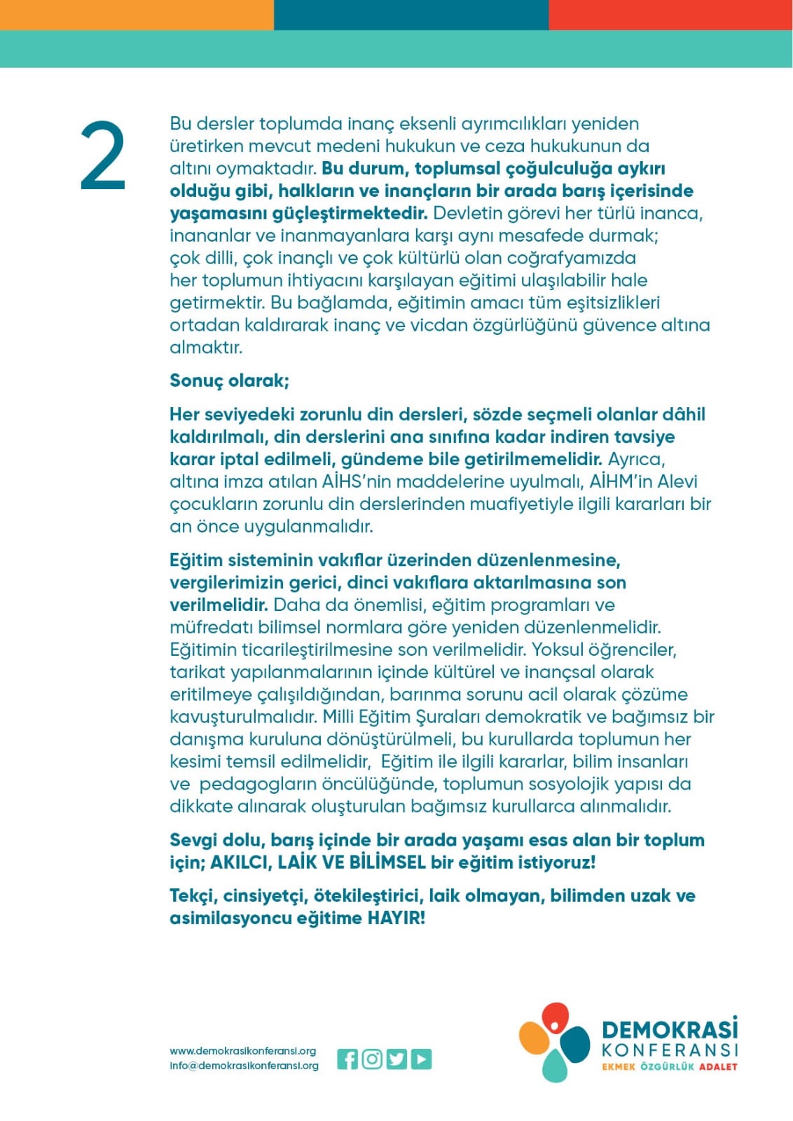 Her seviyedeki zorunlu din dersleri, sözde seçmeli olanlar dâhil kaldırılmalı, din derslerini ana sınıfına kadar indiren tavsiye karar iptal edilmeli, gündeme bile getirilmemelidir. Ayrıca, altına imza atılan AİHS’nin maddelerine uyulmalı, AİHM’in Alevi çocukların zorunlu din derslerinden muafiyetiyle ilgili kararları bir an önce uygulanmalıdır. Eğitim sisteminin vakıflar üzerinden düzenlenmesine, vergilerimizin gerici, dinci vakıflara aktarılmasına son verilmelidir. Daha da önemlisi, eğitim programları ve müfredatı bilimsel normlara göre yeniden düzenlenmelidir. Eğitimin ticarileştirilmesine son verilmelidir. Yoksul öğrenciler, tarikat yapılanmalarının içinde kültürel ve inançsal olarak eritilmeye çalışıldığından, barınma sorunu acil olarak çözüme kavuşturulmalıdır. Milli Eğitim Şuraları demokratik ve bağımsız bir danışma kuruluna dönüştürülmeli, bu kurullarda toplumun her kesimi temsil edilmelidir, Eğitim ile ilgili kararlar, bilim insanları ve pedagogların öncülüğünde, toplumun sosyolojik yapısı da dikkate alınarak oluşturulan bağımsız kurullarca alınmalıdır.