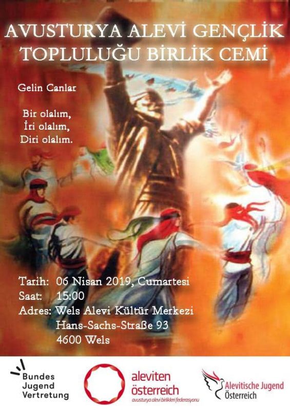 Cumartesi günü 06.04.2019, saat 15.00´de Avusturya Alevi Genclik Toplulugun (AAGT) dernegimizde düzenleyecegi Birlik Cem Erkanina tüm Canlarimizi bekleriz.