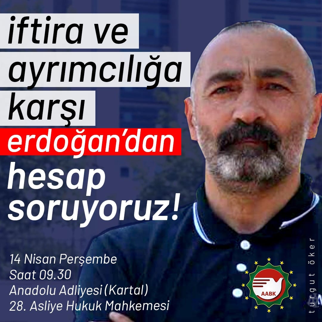 AABK Onursal Başkanı Turgut Öker’in, AKP Genel Başkanı Recep Tayyip Erdoğan’a karşı açtığı 5 kuruşluk manevi tazminat davasının duruşması, 14 Nisan Perşembe günü İstanbul Kartal Adliyesi’nde görülecek. Duruşma günü yaklaşırken Alevi Yurttaşlar İnisiyatifi,  ”14 Nisan’da İstanbul Kartal Adliyesi‘nde Aleviliği Savunmanın Onurunu Yaşayalım ” siyarıyla dayanışma çağrısı yaptı. Çağrı metninde şu ifadeler yer alıyor: