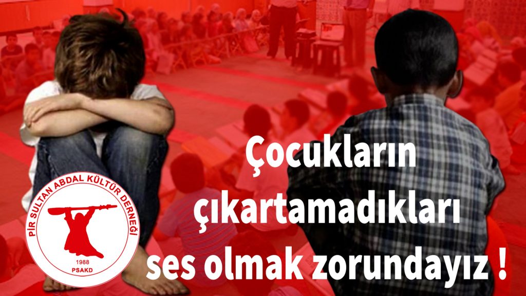 Pir Sultan Abdal Kültür Derneği ( PSAKD) Genel Merkezi, Erzurum’daki gelişmelere ilişkin yazlı bir açıklama yaptı. ”Erzurum’daki Kura’an kursunda çocukların Diyanet personelince aylarca cinsel istismara maruz bırakılması olayını örtbas etmeye çalışan DİB’in tüm engelleme girişimlerine rağmen mağdur ailelerin çığlıkları yandaş olmayan basın kuruluşlarınca ekranlara taşınmıştır. Halkın haber alma hakkını yerine getiren özgür medya kuruluşları ne gazetecilik ilkelerini ne de hukuk kurallarını çiğnemeden yalnızca işlerini yapmışlardır. Ancak buna karşı çoğunluğunu saray rejimi mensupların oluşturduğu RTÜK tarafından DİB’e bağlı Kur’an kursunda yaşanan skandalları haberleştiren bağımsız televizyon kanallarına ceza kesilmiştir” ifadelerin yer aldığı Pir Sultan Abdal Kültür Derneği ( PSAKD) Genel Merkezi’nin açıklamasında, şunlar kaydedildi: