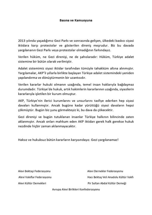 Alevi Bektaşi Federasyonu, Avrupa Alevi Birlikleri Konfederasyonu, Alevi Vakıflar Federasyonu, Alevi Dernekler Federasyonu, Alevi Kültür Dernekleri, Hacı Bektaş Veli Anadolu Kültür Vakfı ve Pir Sultan Abdal Kültür Derneği tartafından yapılan ortak yazılı açıklamada, “Verilen hüküm, ne Gezi direnişi, ne de şahıslaradır: Hüküm, Türkiye adalet sistemine bir bütün olarak verilmiştir. Haksız ve hukuksuz bütün kararların karşısındayız. Gezi yargılanamaz” denildi.