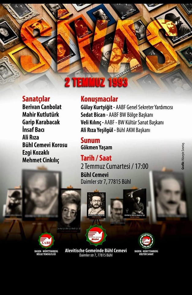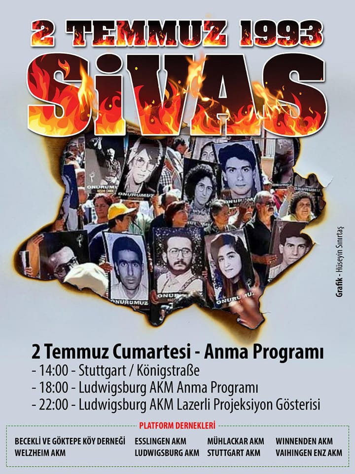 1993 te Sivasta Madımak otelinde ölüme terkedilen, devletin güvenlik güçleri tarafından korunmayan ve yitirilen Canlar bu yılda hem Türkiye’ de hemde yurtdışında güçlü etkinliklerle, panellerle, mitinglerle anılacaklar. Madımak katliamında hayatını kaybedenler özellikle Almanya’ da bir çok şehirde anılacaklar. Anmlar Honnever, Hamburg, Frankfurt, Nürnberg, Stuttgart, Bühl Cemevi, Duisburg, Berlin, Bad Hamburg, Köln, Saarbrücken ve Hamm’ da gerçekleşecek.