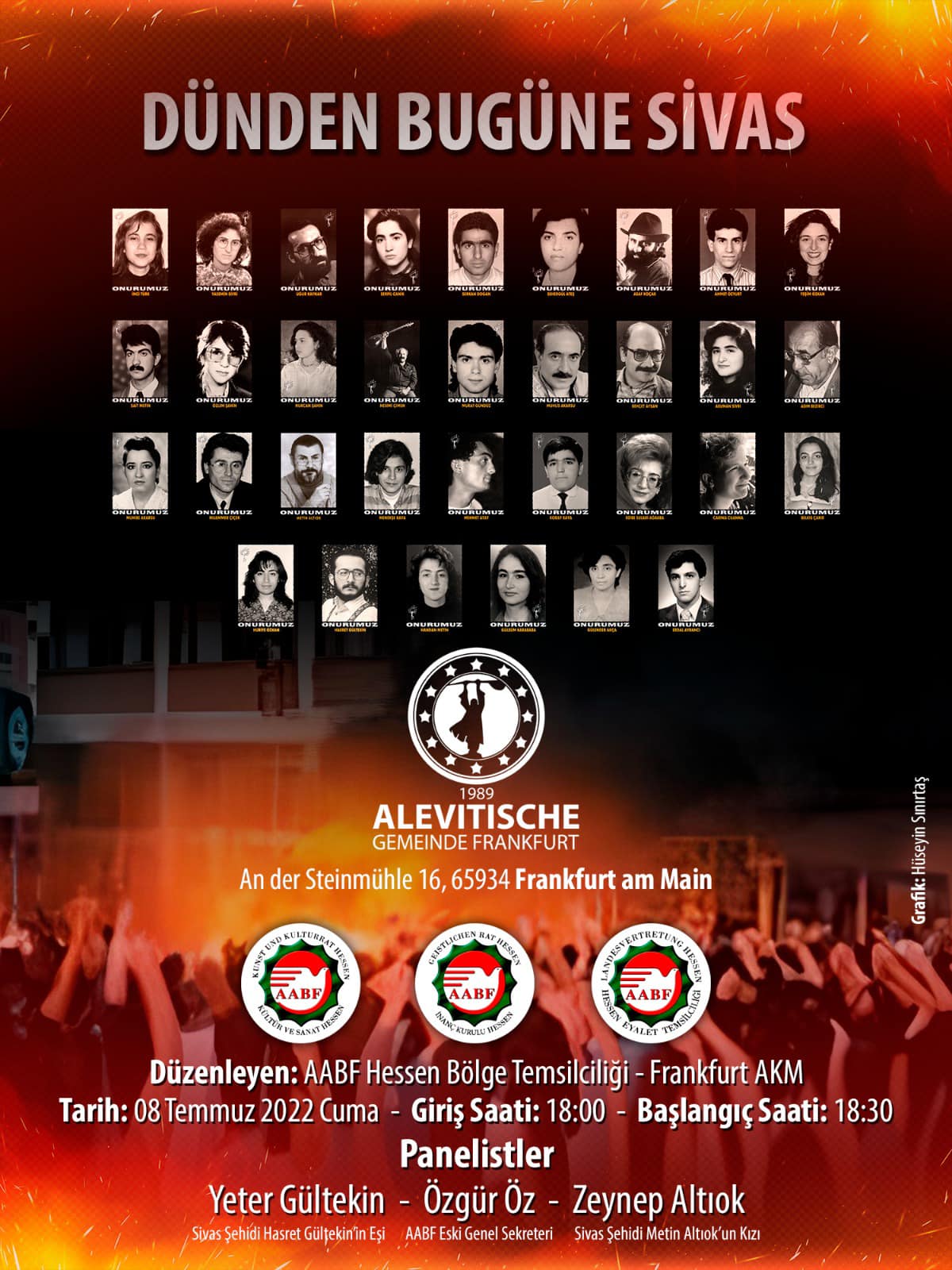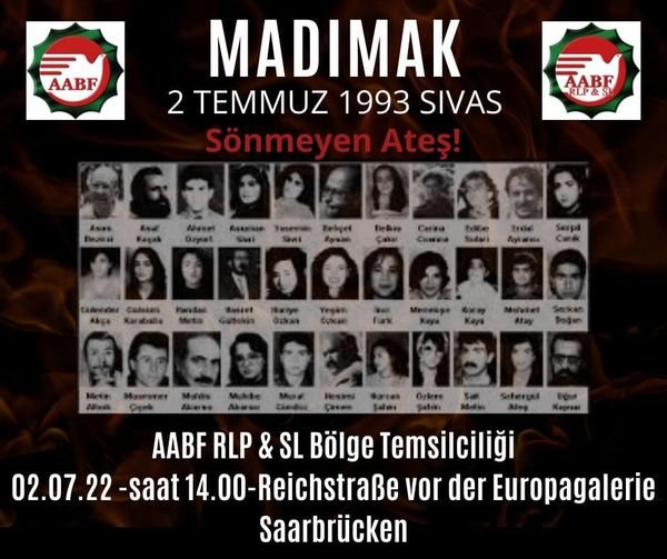 AABF NRW Bölge Temsilciliğinin organizasyonuyla ‘’ MADIMAK 2 Temmuz 1993 Sivas Sönmeyen Ateş ‘’Sloganıyla Almanyada’ ki ilk açık hava Anma mitingi 2 Temmuz Cumartesi Köln- Neumarkta saat 16.00 da, Saarbrückendeki Reichstrasse Europa Galerisinin önünde saat 14.00 de başlarken diğer Anma Etkinliği ise 6 Temmuz Çarşamba günü saat 19.00 da Alpenrosenweg 6, 50769 adresindeki Köln Alevi Kültür Merkezinde (AKM) yapılacak. Ali Eren’ in moderasyonluğunu üstleneceği Panelde AABK Genel Başkanı Hüseyin Mat, Sivas şehidi Şair Metin Altıok’ un kızı CHP eski Milletvekili Yazar Zeynep Altıok ve AABF NRW Bölge başkanı Selahattin Göktürk konuşmacı olarak katılacaklar.
