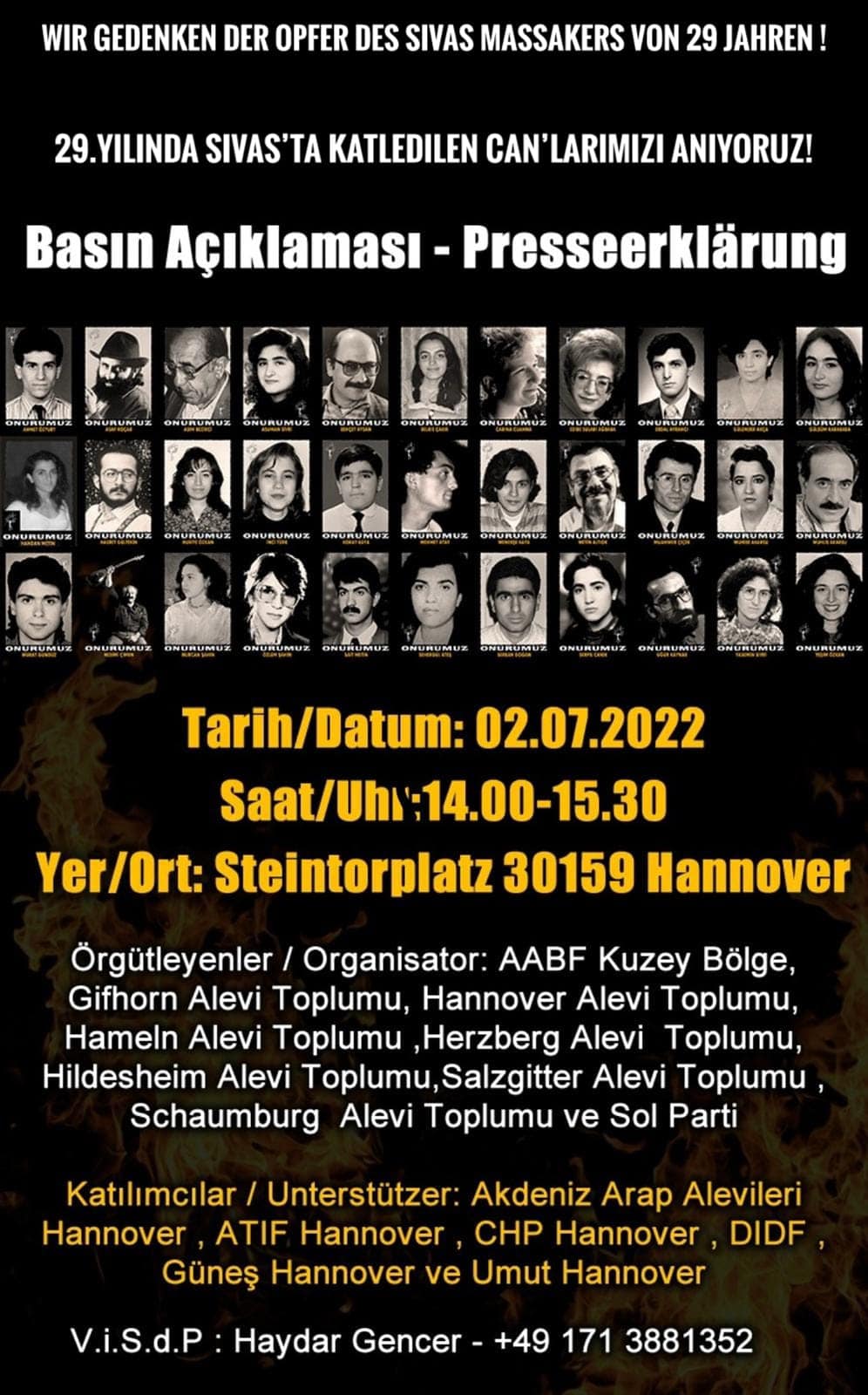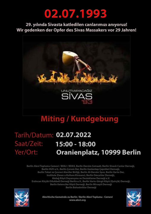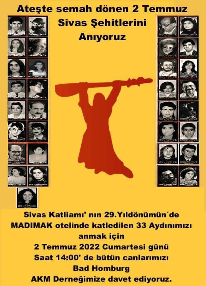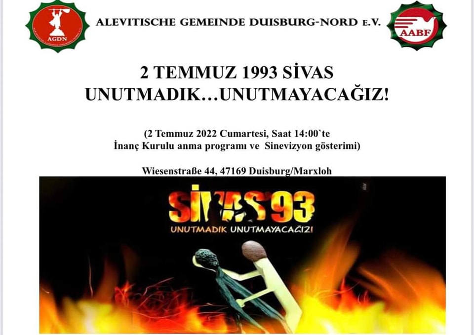 Yine Kuzey Ren Vesfalya Eyaletindeki diğer Anma toplantısı ise 03.07.2022 Pazar günü saat 12.30 da ‘’Sivası unutma, unutturma ‘’ çağrısıyla Hamm’ da Hamm Alevil Kültür Birliği Cemevin’ de yapılacak. Sivas Davası Avukatlarından Murat Demir Hamm’ da Sivas katliamının arka planını, davada yaşanan hukuksuzlukları ve davanın geldiği aşamayı katılımcılara anlatacak.