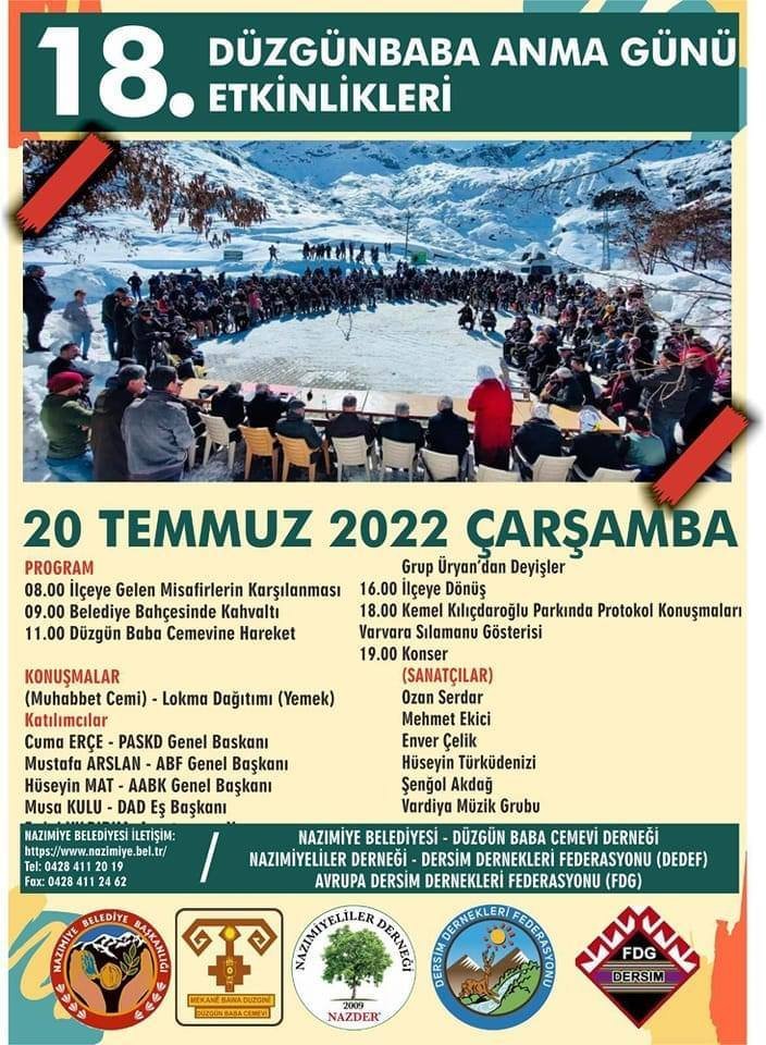 Nazımiye Belediyesi, Düzgün Baba Cemevi Derneği, Nazımiyeliler Derneği, Dersim Dernekleri Federasyonu ve Avrupa Dersim Dernekleri Federasyonu iş birliğiyle yapılacak olan 18. Düzgün Baba Anma Günü etkinlikleri 20 Temmuz’da yapılacak.