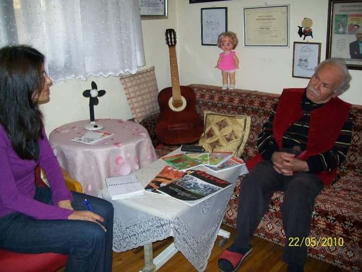 Evinin kapısında Sevimli tonton haliyle kısık gözlerinde ki sevecen gülüşüyle Dostça karşılıyor bizi. Tavır dergisi olarak sunduğumuz bir buket çiçeğimize dünyanın en mutlu insanı oluyor. Tavır dergisini tanıdığını söylüyor. Ve röportajımızdan çok mutlu olacağını ifade ediyor. Çalışma odası olarak kullandığı bir odaya geçiyoruz. Sade temiz ve Mütavizi kişiliği ve çocuk sevgisi çalışma odasının her yanına sinmiş. Kitaplarını tanıtıyor bizlere