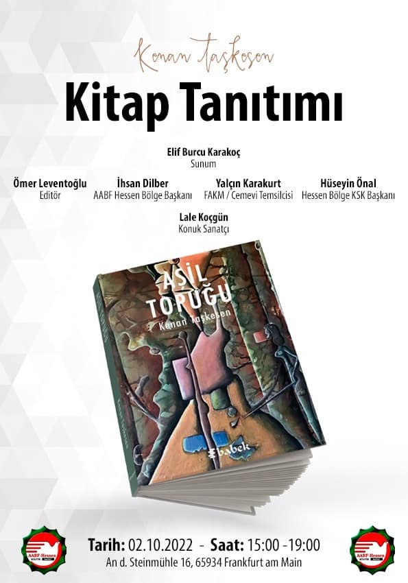 Gün yüzüne çıkan “AŞİL TOPUĞU” isimli kitabımın imza günü için tüm dostları 02.10.2022 tarihinde, saat 15:00 de Frankfurt Cemevi’nde görmekten onur duyarım.