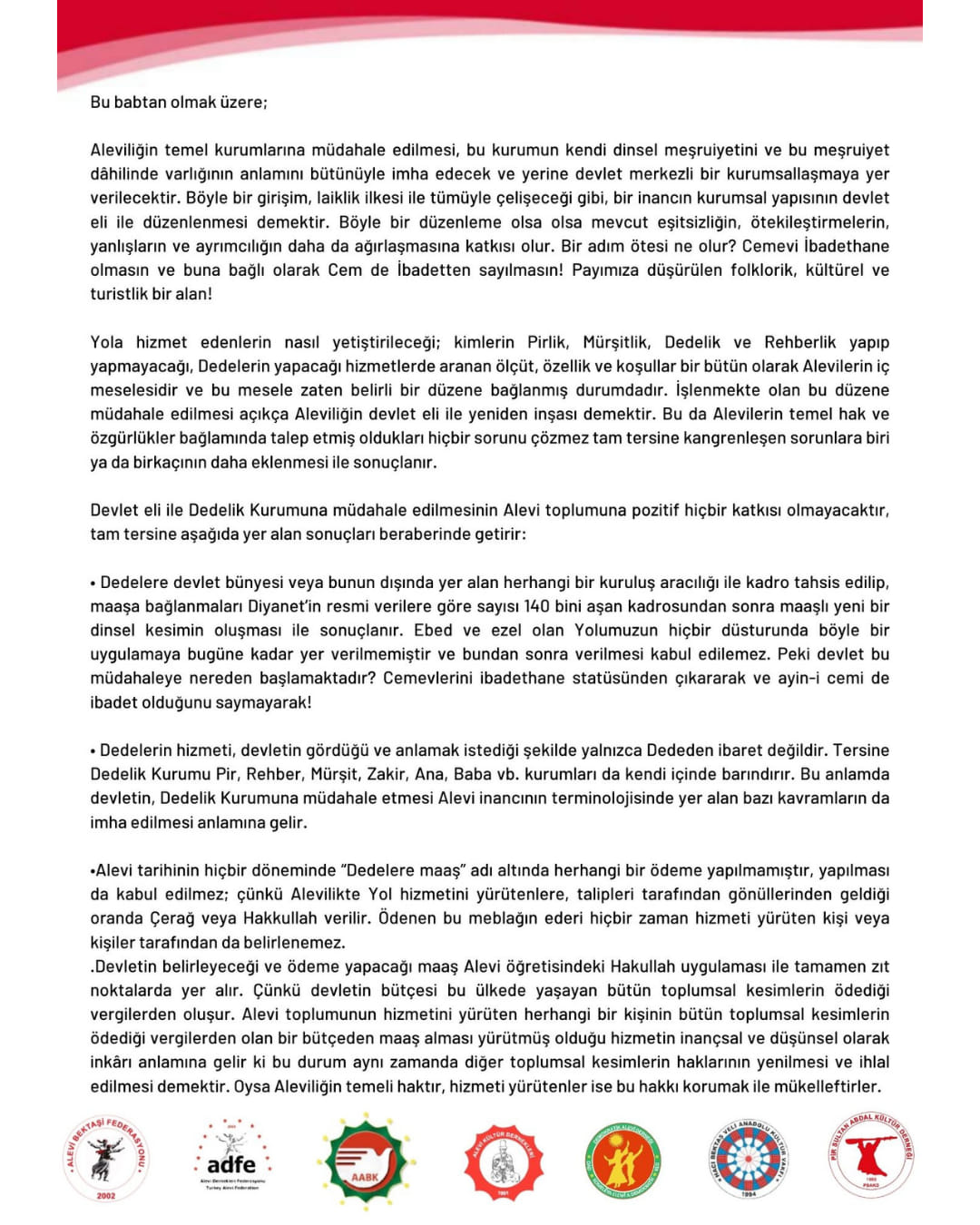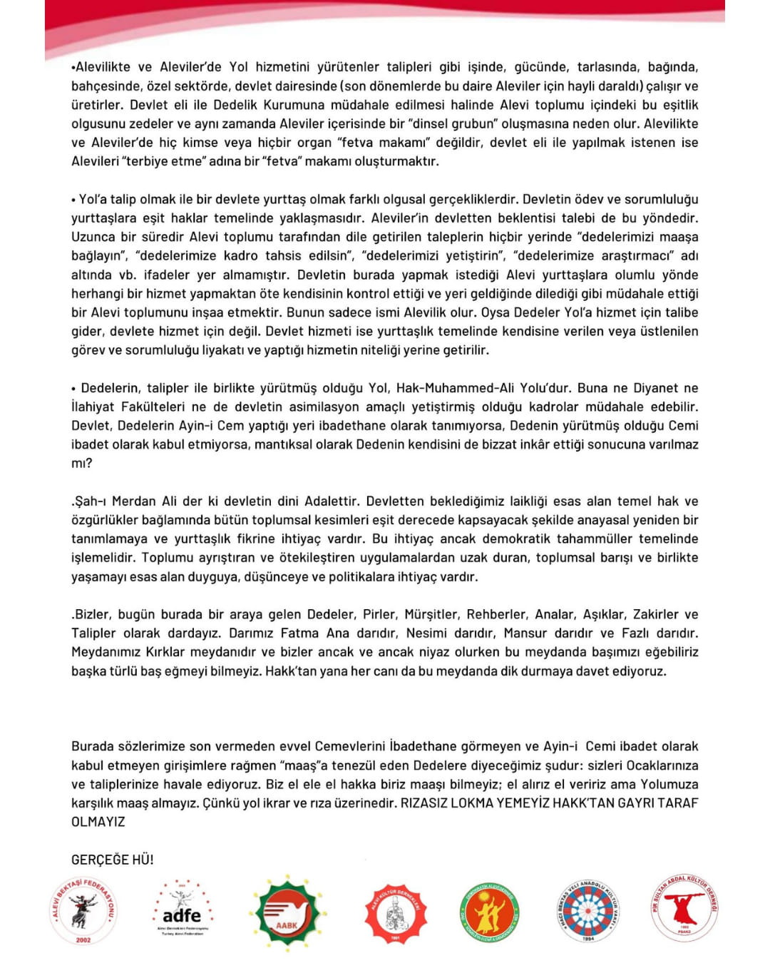 -Burada sözlerimize son vermeden evvel cemevlerini ibadethane görmeyen ve ayin-i cemi ibadet olarak kabul etmeyen girişimlere rağmen “maaş”a tenezül eden dedelere diyeceğimiz şudur: sizleri ocak/larınıza ve taliplerinize havale ediyoruz. Biz el ele el hakka biriz maaşı bilmeyiz; el alırız el veririz ama Yolumuza karşılık maaş almayız. Çünkü yol ikrar ve rıza üzerinedir. Rızasız lokma yemeyiz, Hakk’tan gayrı taraf olmayız!