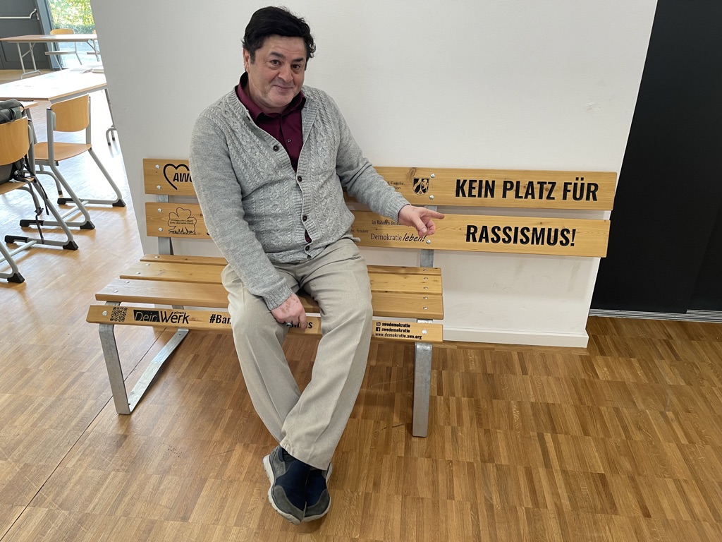 Bankın dizaynı-şekli mesajını net bir şekilde ortaya koyuyor: arkalık yaklaşık iki metre uzunluğundayken, koltuk yaklaşık yarım metre daha kısa. Ahlen’deki AWO’da entegrasyon uzmanı ve