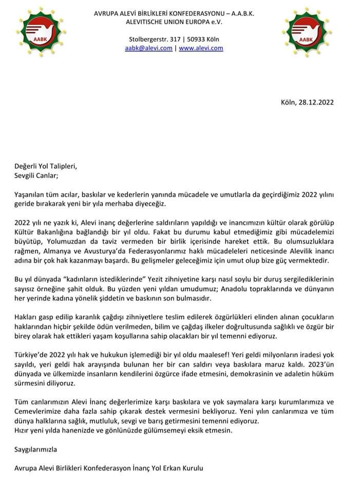 2022 yılı ne yazık ki, Alevi inanç değerlerine saldırıların yapıldığı ve inancımızın kültür olarak görülüp Kültür Bakanlığına bağlandığı bir yıl oldu. Fakat bu durumu kabul etmediğimiz gibi mücadelemizi büyütüp, Yolumuzdan da taviz vermeden bir birlik içerisinde hareket ettik. Bu olumsuzluklara rağmen, Almanya ve Avusturya’da Federasyonlarımız haklı mücadeleleri neticesinde Alevilik inancı adına bir çok hak kazanmayı başardı. Bu gelişmeler geleceğimiz için umut olup bize güç vermektedir.