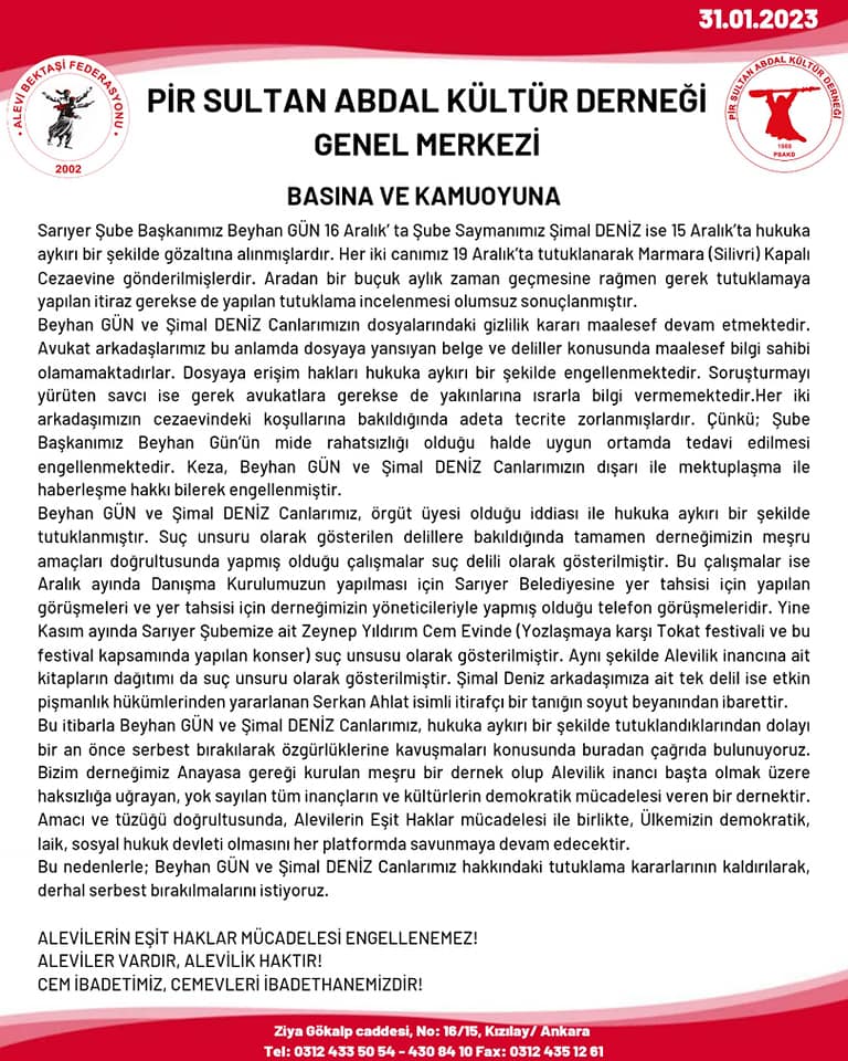 ”PSAKD Sarıyer Şube Başkanımız Beyhan Gün ve Şube Yöneticimiz Şimal Deniz Canlarımız hakkındaki tutuklama kararlarının kaldırılarak, derhal serbest bırakılmalarını istiyoruz” ifadelerinin yer aldığı, Pir Sultan Abdal Kültür Derneği’nin açıklamasının tam metni şöyle: