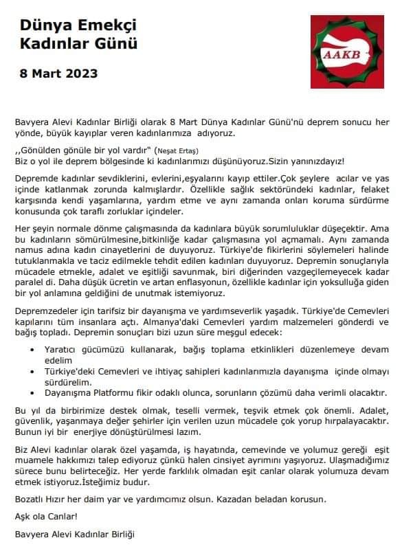 Bavyera Alevi Kadınlar Birliği, 8 Mart Dünya Emekçi Kadınlar Günü dolayısıyla yazılı bir açıklama yaptı. ” Bavyera Alevi Kadınlar Birliği olarak 8 Mart Dünya Kadınlar Günü’nü deprem sonucu her yönde, büyük kayıplar veren kadınlarımıza adıyoruz” ifadelerinin yer aldığı açıklamanın devamında, şunlar kaydedildi: