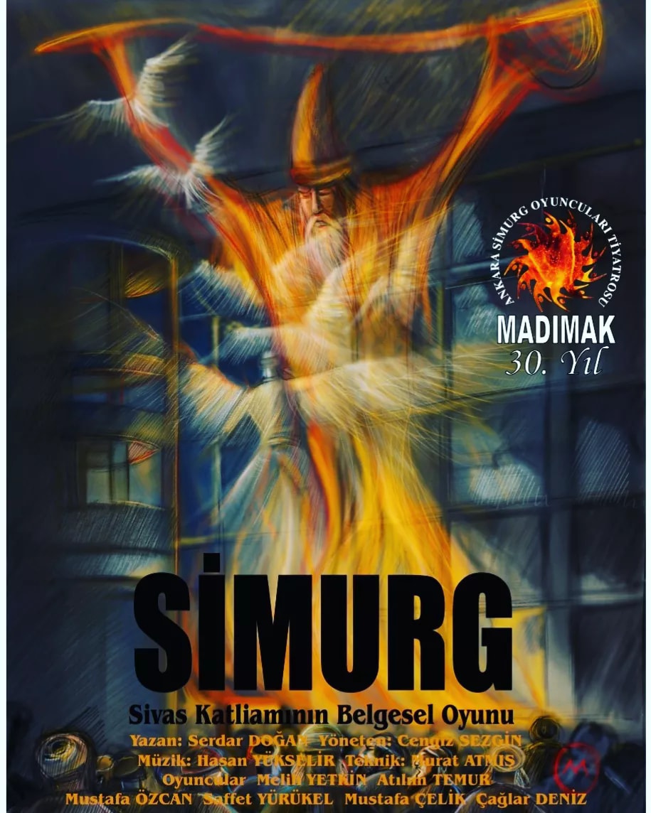 Serdar Doğan’ın “Simurg” adlı eseri de, bu türden bir ateş öyküsüdür. Aralarında ülkemizin yetiştirdiği çok değerli aydın ve sanatçıların, gencecik kültür gönüllülerinin bulunduğu her biri eşsiz 33 insanın yakılarak, boğularak öldürüldüğü “Sivas-Madımak Oteli Yangını” Serdar Doğan’ın eserinin ana konusudur. Serdar, katliamdan sonra otelin alt katına yerleşen kebapçı-pideci dükkânından yola çıkar. Dükkân fırınında yanmakta olan ateş ve kızaran etin kokusu, orada henüz bir kaç yıl önce yaşanmış büyük facia ile tüyler ürperten bir yakınlık ve isyan duygusu yaratan bir karşıtlık oluşturmaktadır. Serdar, bu çatışmalı durumdan derin bir ahlaki tartışma, toplumsal ve tarihsel sorunlar üzerine geniş bir yorum olanağı veren estetik bir bütünlük çıkarmayı başarmıştır. Oyun, ustaca çizilmiş portreler aracılığıyla Sivas’ta yitirdiklerimizin taşıdıkları ve temsil ettikleri değerleri yeniden düşünmemiz için bize bir yol açıyor. Bu arada, yalnızca onlara yakılmış ağıtlarla, onlar için bir saygı duruşuyla yetinenlere karşı da sözünü esirgemiyor. Böylece Simurg, geçmişte ve bugün, toplumsal- siyasal sorumluluklarımız ve görevlerimiz karşısında her ne yaptıysak ve yapıyorsak onları düşünmemiz ve dersler çıkarmamız için de açık bir çağrı niteliği taşıyor.