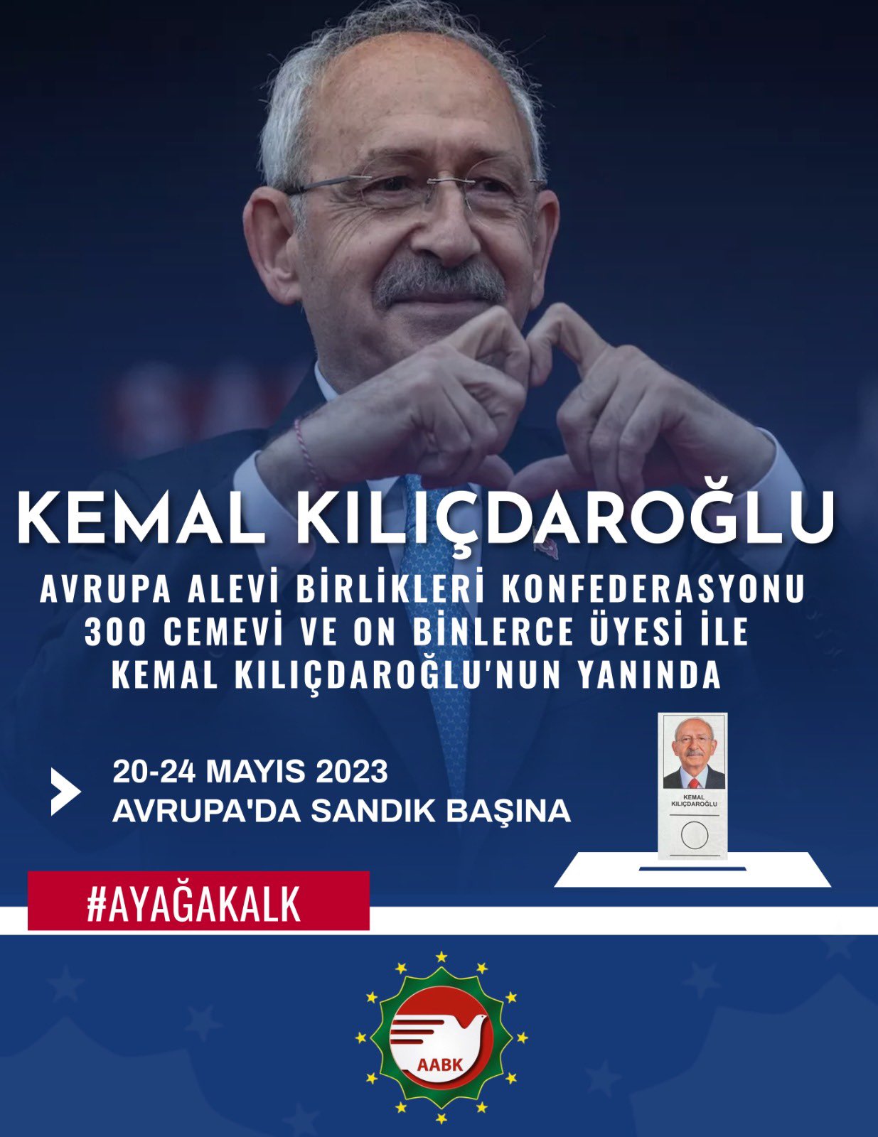 Avrupa Alevi Birlikleri Konfederasyonu ( AABK), ” 20- 24 Mayıs’ta Avrupa’da sandık başına‘‘ başlığıyla yaptığı açıklamada şu ifadelere yer verdi: ‘‘Avrupa Alevi Birlikleri Konfederasyonu ( AABK) 300 Cemevi ve on binlerce üyesi ile Kemal Kılıçdaroğlu’nun yanında ” dedi.