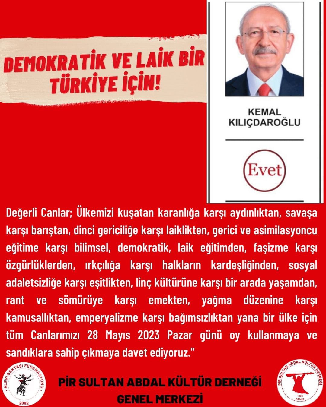Kemal Kılıçdaroğlu’na bir destekte Pir Sultan Abdal Kültür Derneği ( PSAKD) Genel Merkezi’nden geldi. PSAKD Genel Merkezi, 28 Mayıs 2023 Pazar günü yapılacak seçimlerede Kemal Kılıçtaroğlu’na oy vereceklerini şu ifadeleri kullanarak kamuoyuna duyurdu: