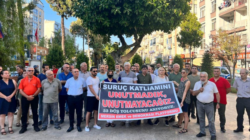 Anmaya Yeşil Sol Parti Mersin Milletvekilleri Perihan Koca ve Ali Bozan, HDP eski İzmir Milletvekili Murat Çepni’nin yanı sıra çok sayıda kişi katıldı. Anmada “Suruç katliamını unutmadık unutturmayacağız”, “33 düş yolcusunu anıyoruz” pankartı taşındı.