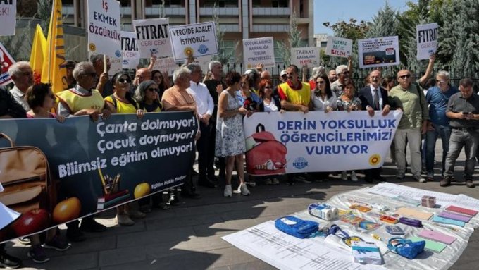 Eğitim ve Bilim Emekçileri Sendikası (Eğitim Sen) ve Eğitim Hakkı Platformu, artan okul masraflarına ilişkin Ankara’da bulunan Milli Eğitim Bakanlığı önünde basın açıklaması düzenledi. Eylemde, “Derin yoksulluk öğrencilerimizi vuruyor” ve “Çanta dolmuyor, çocuk doymuyor, bilimsiz eğitim olmuyor” pankartları açıldı.
