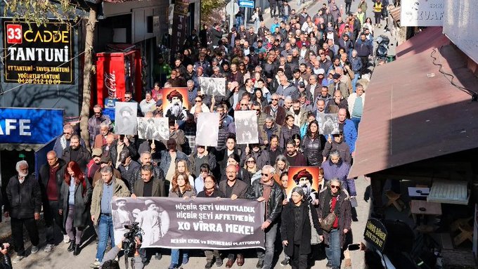 Elazığ’da Buğday Meydanında 87 yıl önce idam edilen Seyid Rıza ve arkadaşları Dersim’de anıldı. Sanat Sokağı’nda bir araya gelen Dersim Emek ve Demokrasi Platformu, “Hiçbir şeyi unutmadık, hiçbir şeyi affetmedik. Xo virra meke” pankartı ve katledilenlerin fotoğraflarının olduğu döviz taşıdı. Ağıtlar eşliğinde Seyid Rıza Meydanına yapılan yürüyüşe, Halkların Eşitlik ve Demokrasi Partisi (DEM Parti) Grup Başkanvekili Gülistan Kılıç Koçyiğit, DEM Parti Halklar ve İnançlar Komisyonu Eşsözcüsü Yüksel Mutlu ve Dersim Milletvekili Ayten Kordu da katıldı.