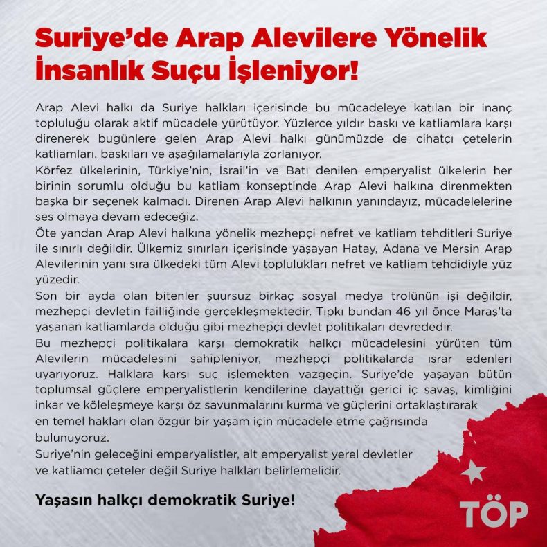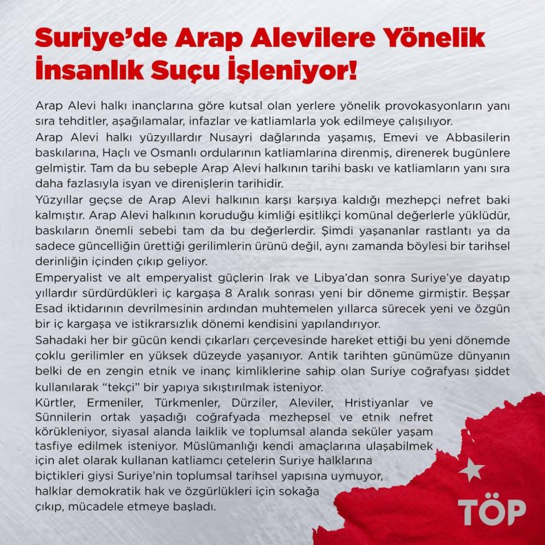 ”Suriye’de Arap Alevilere Yönelik İnsanlık Suçu İşleniyor” başlıklı TÖP açıklamasında, şu ifadelere yer verilmiş: ”Arap Alevi halkı inançlarına göre kutsal olan yerlere yönelik provokasyonların yanı sıra tehditler, aşağılamalar, infazlar ve katliamlarla yok edilmeye çalışılıyor.