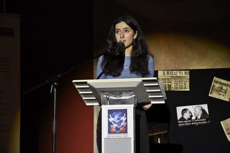 Önceki gün Cemevi Ana salonunda düzenlenen anmaya, BAT-Cemevi Yönetim, İnanç, Kadın, Gençlik (BDAJ), BDAS temsilcileri ile kardeş dernek temsilcileri ve çok sayıda kişi katıldı. Moderatörlüğünü Ela Atlas (BDAJ Eş Başkanı) ve Berivan Zara Aksu’nun (BDAS Genel Sekter) yaptığı anma etkinliği selamlama konuşması, katledilen canlar aşkına saygı duruşu ile Onur Karaer Dede tarafından verilen gülbenk ve çerağ uyandırma ile başladı. Ardından Maraş katliamına ilişkin sinevizyon gösteri gerçekleşti ve gösterim sonrası Cemevi adına Yönetim Kurulu Başkanı Dr. Yüksel Özdemir konuşma yaptı. Katledilen canları anarak konuşmasına başlayan Özdemir, Maraş katliamının planlı programlı bir devlet katliamı olduğuna dikkat çekerek, bu katliamların nedenin Alevilerin kendine özgü farklı bir inanç olmasından kaynaklandığının altını çizdi. Özdemir’in ardından anma programı, Asmin Kök’ün okuduğu şiir, Berivan Zara Aksu’nun, Hüseyin Yıldız tarafından yazılan ve Maraş katliamını da içeren “Wenn Aleviten träumen“ isimli kitabından pasajlar okuması ve ardından BDAS Yönetim Kurulu üyesi İlayda Çakır’ın konuşmasıyla devam etti.