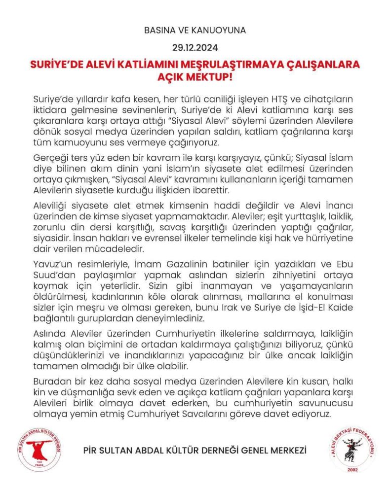 ” Suriye’deki Alevi katliamını meşrulaştırmaya çalışanlara açık mektup” başlığıyla yapılan açıklamada, ”Suriye’de yıllardır kafa kesen, her türlü caniliği işleyen HTŞ ve cihatçıların iktidara gelmesine sevinenlerin, Suriye’de ki Alevi katliamına karşı ses çıkaranlara karşı ortaya attığı “Siyasal Alevi” söylemi üzerinden Alevilere dönük sosyal medya üzerinden yapılan saldırı, katliam çağrılarına karşı tüm kamuoyunu ses vermeye çağırıyoruz” denildi.