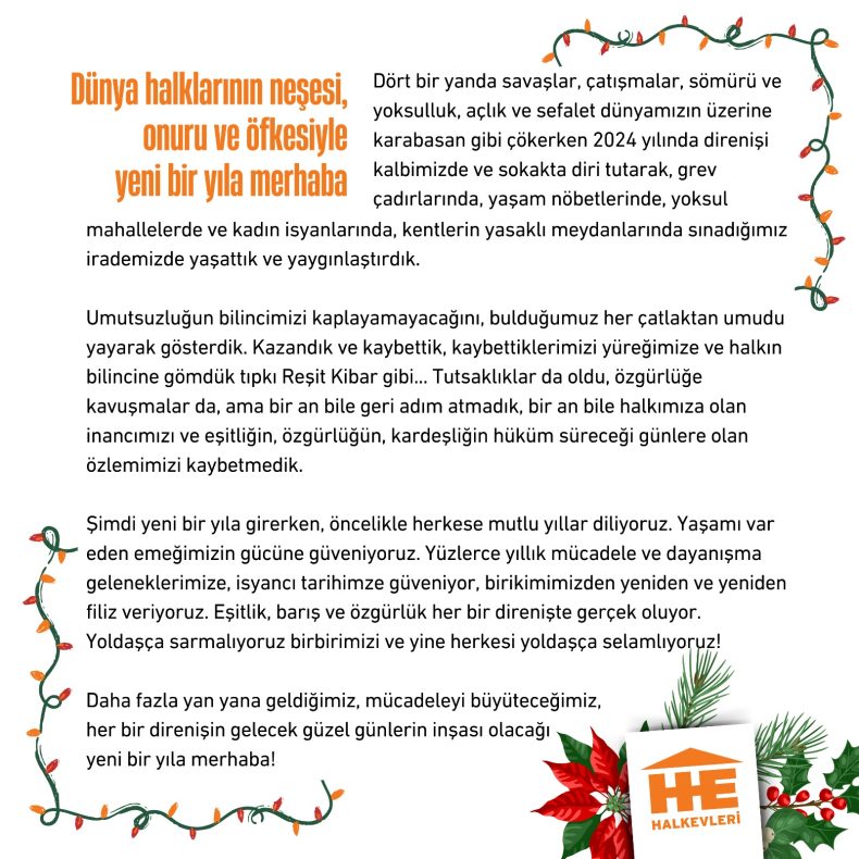 Halkevleri yeni yıl mesajı yayınladı. ”Dünya halklarının neşesi, onuru ve öfkesiyle yeni bir yıla merhaba” başlıklı kutlama mesajında şu ifadeler yer alıyor: