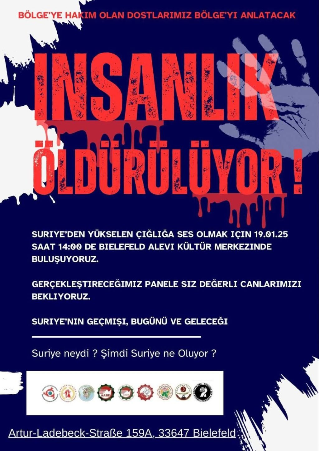 “Suriye’den yükselen çığlığa ses olmak için, 19.01.2025 tarihinde saat 14:00’te Bielefeld Alevi Kültür Merkezi’nde buluşuyoruz.