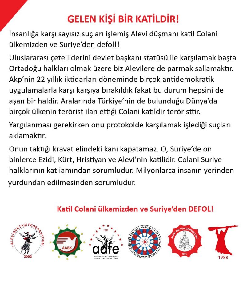 Alevi kurumlarından Colani protestosu: “Dünya’da birçok ülkenin terörist ilan ettiği Colani katildir, teröristtir!”