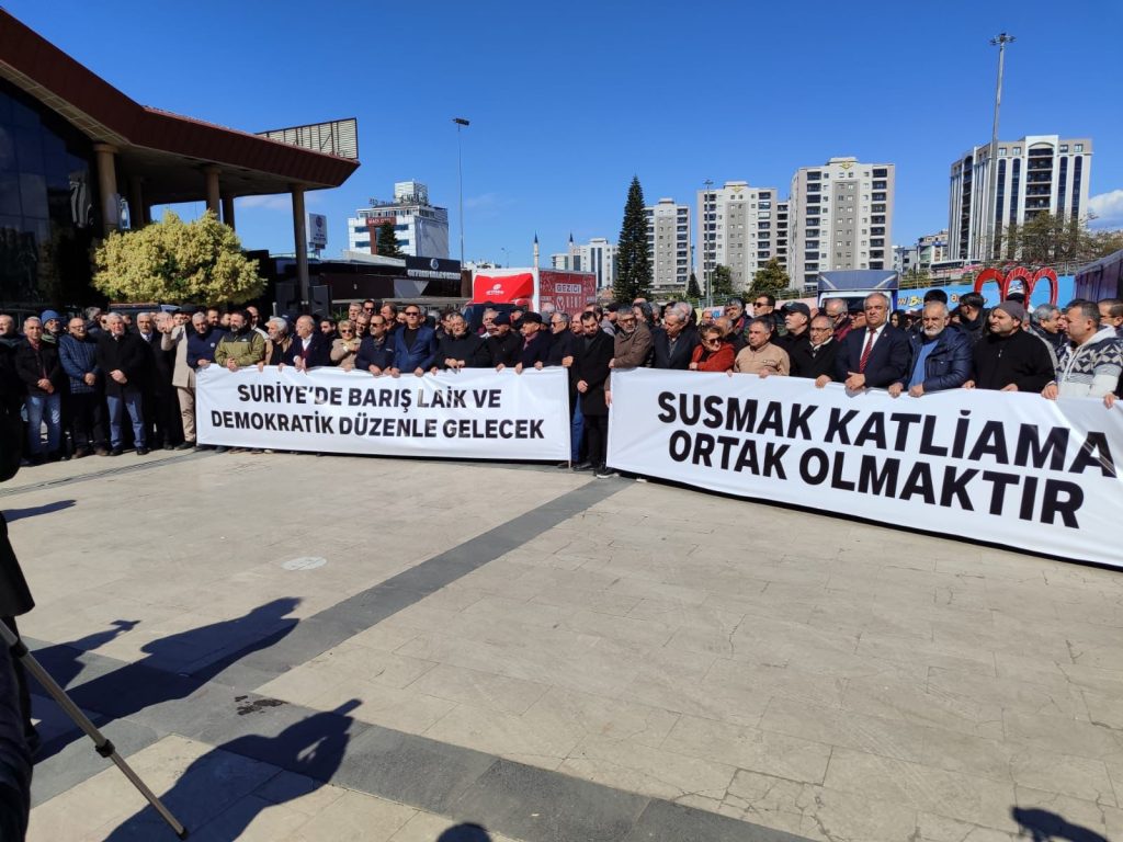 Adana’da Alevi Sivil İnisiyatifi, Seyhan Belediyesi Yaşar Kemal Kültür Merkezi önünde bir basın açıklaması düzenleyerek, Suriye’de Alevi toplumu başta olmak üzere farklı inanç gruplarına yönelik baskı ve insan hakları ihlallerine dikkat çekti. Açıklamaya, Alevi kanaat önderlerinin yanı sıra Ehlibeyt Kültür ve Dayanışma Vakfı (EHDAV) Başkanı Ali Yeral, Alevi Bektaşi Federasyonu (ABF) Genel Başkanı Mustafa Aslan, siyasi parti temsilcileri ve çok sayıda kişi katıldı. “Suriye’de barış laik ve demokratik düzenle gelecek” ve “Susmak katliama ortak olmaktır” pankartının açıldığı açıklamada sık sık, “Katliama hayır barış hemen şimdi”, “Gün gelecek devran dönecek AKP halka hesap verecek”, “Kurtuluş yok tek başına ya hep beraber ya hiç birimiz” ve  “Faşizme karşı omuz omuza” sloganları atıldı.
