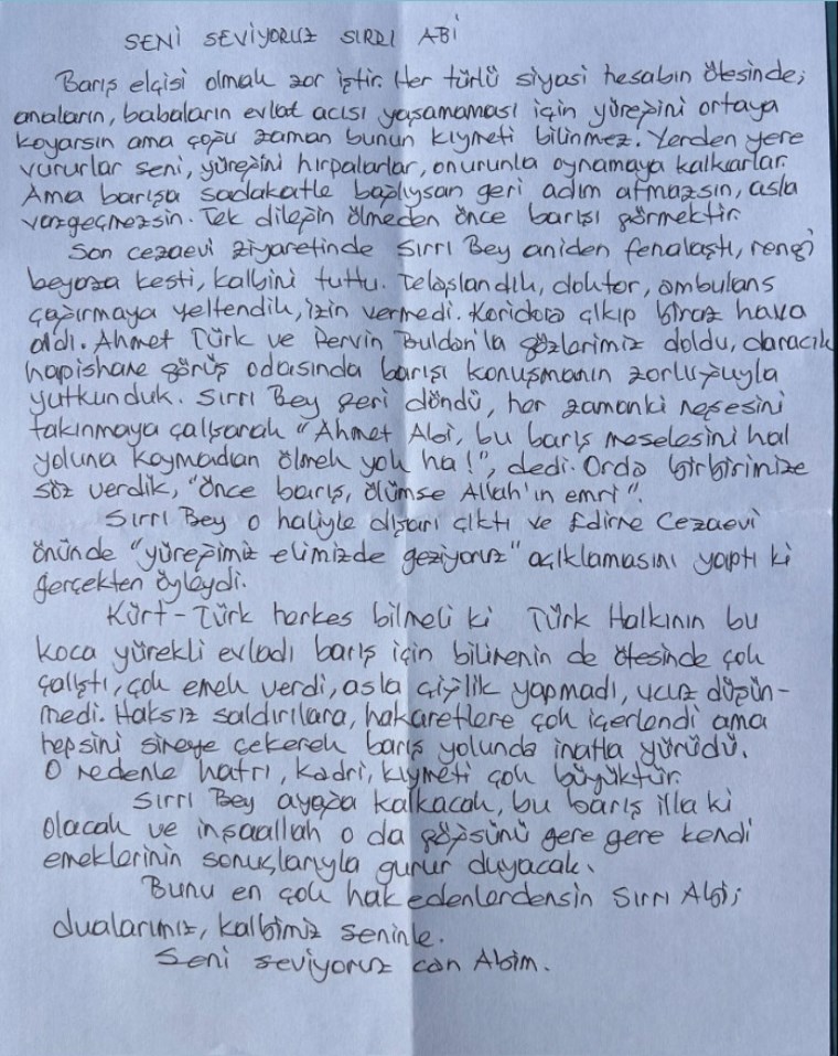 Sırrı Bey ayağa kalkacak, bu barış illa ki olacak ve inşallah o da göğsünü gere gere kendi emeklerinin sonuçlarıyla gurur duyacak. Bunu en çok hak edenlerdensin Sırrı Abi; dualarımız, kalbimiz seninle. Seni seviyoruz can Abim.”