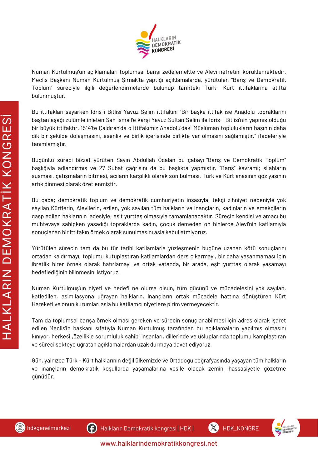 HDK, Numan Kurtulmuş’un Meclis Başkanı sıfatıyla yaptığı açıklamaların tarafsızlık ilkesine aykırı olduğunu ve toplumda kutuplaşmayı körüklediğini belirtti. “Barışa hizmet etmesi gerekenler, halkların ortak hafızasındaki katliamcı simaları olumlayamaz” ifadelerine yer verildi.