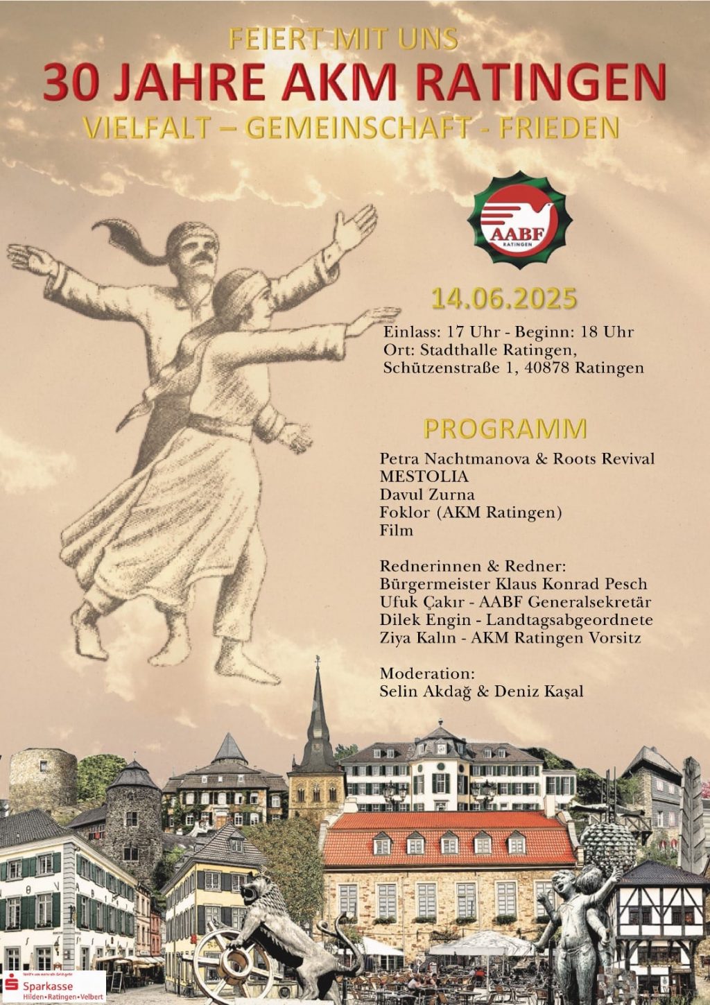 ⌊Hasan Subaşı⌉ Köln ⌉ 1995 yılında kurulan Ratingen Alevi Kültür Merkezi (AKM), 30. kuruluş yıl dönümünü büyük bir etkinlikle kutlamaya hazırlanıyor. “Çeşitlilik – Topluluk – Barış” şiarıyla organize edilen kutlama programı, 14 Haziran 2025 Cumartesi günü Ratingen Stadthalle’de gerçekleştirilecek. Etkinliğe giriş 17.00’de, programın başlangıcı ise 18.00 olarak planlanmış. Gecede müzikten halk danslarına, belgesel gösteriminden konuşmalara kadar birçok içerik yer alacak.