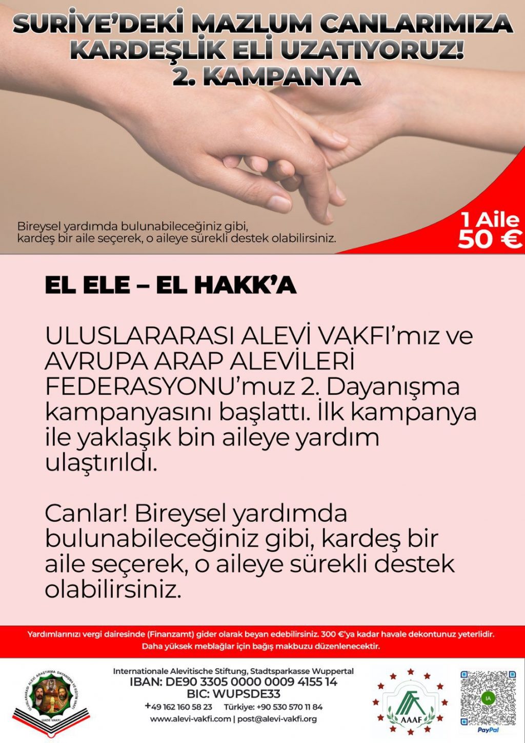 Haber Merekzi – Uluslararası Alevi Vakfı ile Avrupa Arap Alevileri Federasyonu, Suriye’de zor koşullarda yaşam mücadelesi veren mazlum ailelere destek olmak amacıyla “El Ele – El Hakk’a” sloganıyla ikinci yardım kampanyasını başlattı. İlk kampanya ile yaklaşık bin aileye ulaşan kurumlar, bu kez daha geniş bir destek ağı kurmayı hedefliyor.