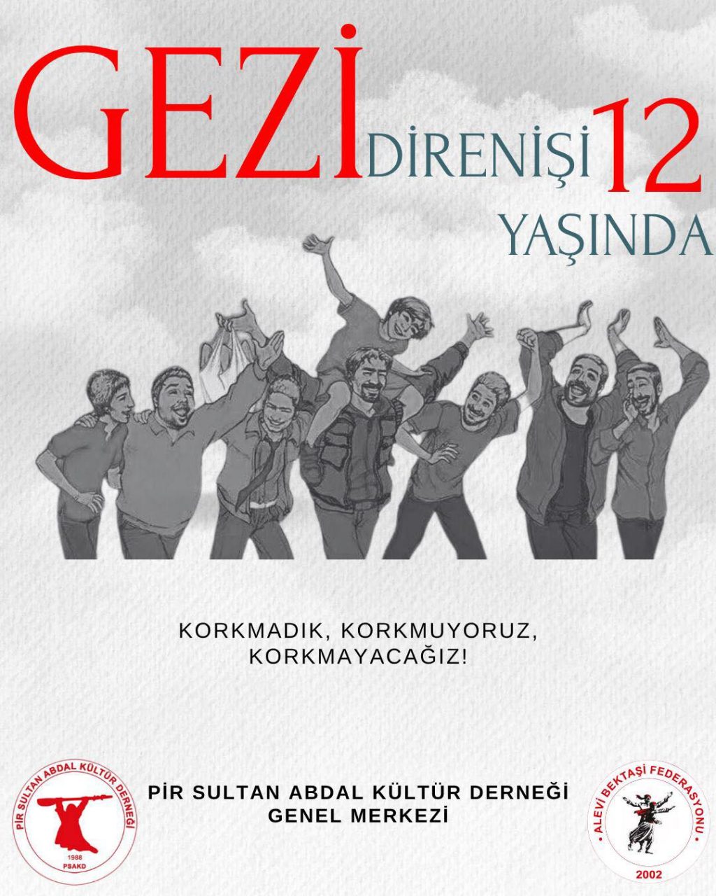 ⌈ Haber Merkezi ⌉ Gezi Direnişi’nin üzerinden 12 yıl geçti. Pir Sultan Abdal Kültür Derneği Genel Merkezi ve Alevi Bektaşi Federasyonu, 2013’te milyonları sokağa döken o büyük halk isyanını anarak, “Korkmadık, korkmuyoruz, korkmayacağız!” mesajını yeniden yükseltti.