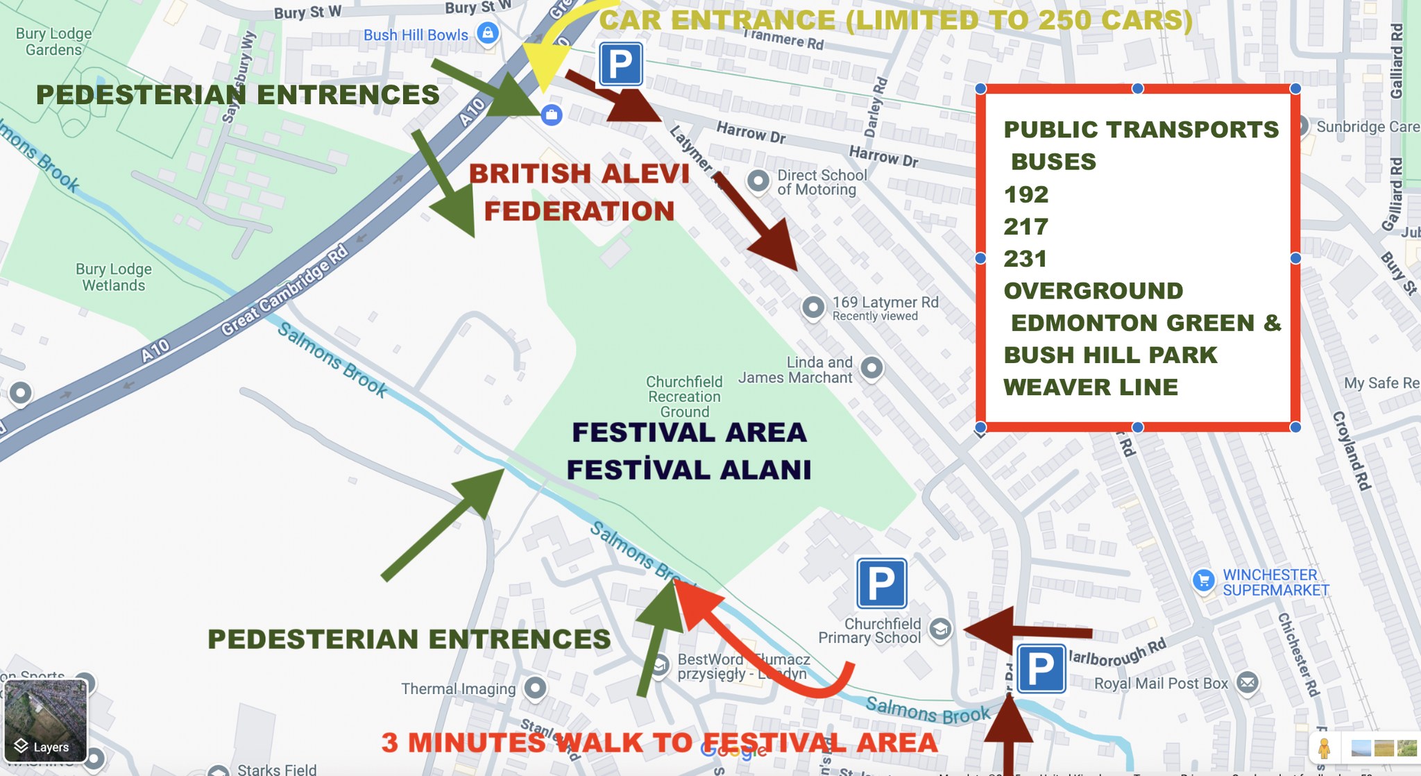 Etkinlik alanına ulaşım sağlayan toplu taşıma hatlarına ilişkin bilgilendirme de festival öncesinde paylaşıldı. Otopark kapasitesinin sınırlı olması ve etkinlik gününde oluşabilecek yoğunluk nedeniyle, organizasyon komitesi özellikle Londra içinde bulunan misafirlerin toplu taşıma araçlarını tercih etmelerini önemle rica etti.
