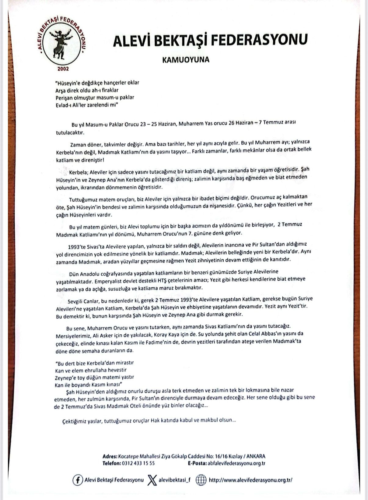⌈Haber Merkezi⌉ Alevi Bektaşi Federasyonu, 26 Haziran’da başlayacak olan Muharrem oruçları öncesinde bir açıklama yayımlayarak, Kerbela’dan Madımak’a uzanan katliam hafızasına ve bu yılki yas günlerinin anlamına dikkat çekti. Açıklamada, yalnızca bir ibadet değil, aynı zamanda bir direnişin nişanesi olan orucun, bu yıl 2 Temmuz Madımak Katliamı’nın yıldönümüyle çakıştığına işaret edildi.