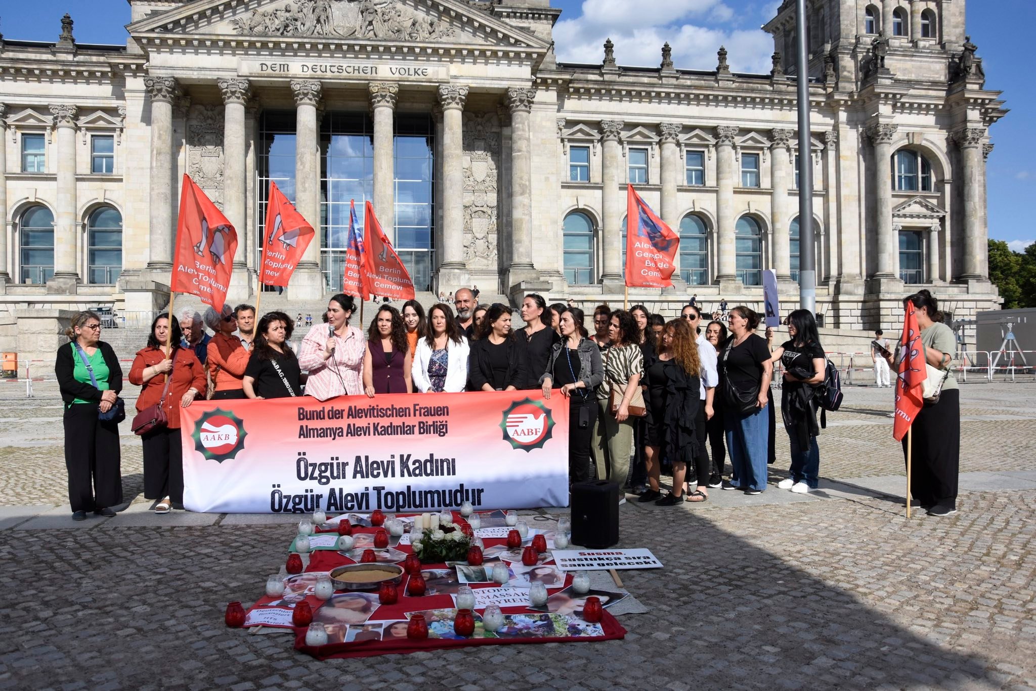 Dün Alman Parlamentosu önünde düzenlenen protestoya, AAKB, AABF İnanç Kurulu, BAT-Cemevi Yönetim, Kadın ve İnanç Kurulları, Arap Alevileri Birliği, kardeş dernek ve siyasi parti temsilcilerinin yanı sıra çok sayıda kişi katıldı.