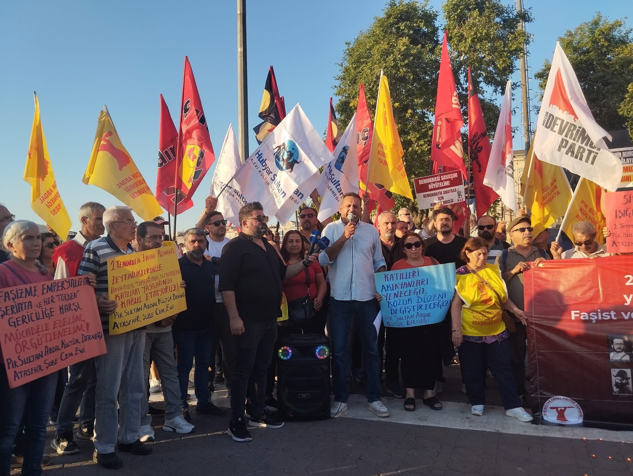 PSAKD İstanbul Şubeleri adına açıklamayı Özkan Tacer okudu. Tacer, 2 Temmuz’un Aleviler için sadece bir anma günü değil, adalet arayışının sürdüğü bir mücadele olduğunu belirtti. “33 canımız 2 Temmuz 1993 Cuma günü Madımak Oteli’nde yakılarak katledildi. Bu vahşi katliamın üzerinden 32 yıl geçti. Ama ne acımız azaldı, ne de öfkemiz dindi. Çünkü adalet yerini bulmadı” dedi.