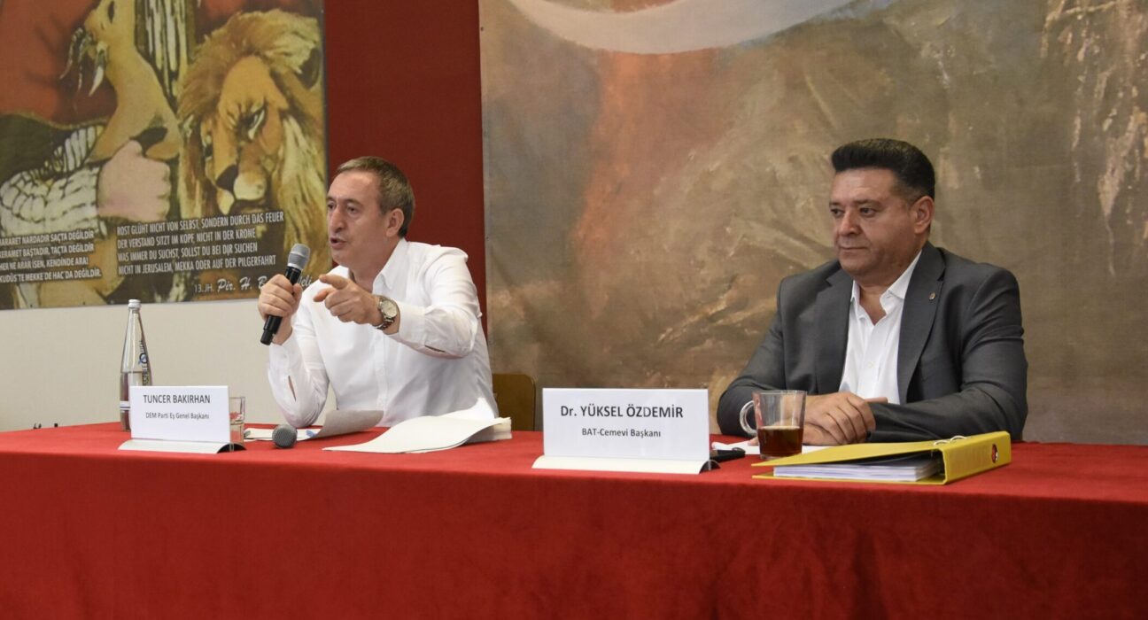 Türkiye’de yeniden başlayan “Çözüm-Barış süreci” kapsamında Almanya’da çeşitli kurum ve kuruluşlara ziyarette bulunan DEM Parti Eş Başkanı Tuncer Bakırhan gezi kapsamında BAT-Cemevi’nin organize ettiği panele katıldı. Alevi toplumunun son güncel gelişmelerle ortaya çıkan kaygı, soru işaretleri ve eleştirilerine cevap veren Bakırhan, “Alevilerin içinde olmadığı bir çözüm süreci mümkün değildir” dedi.