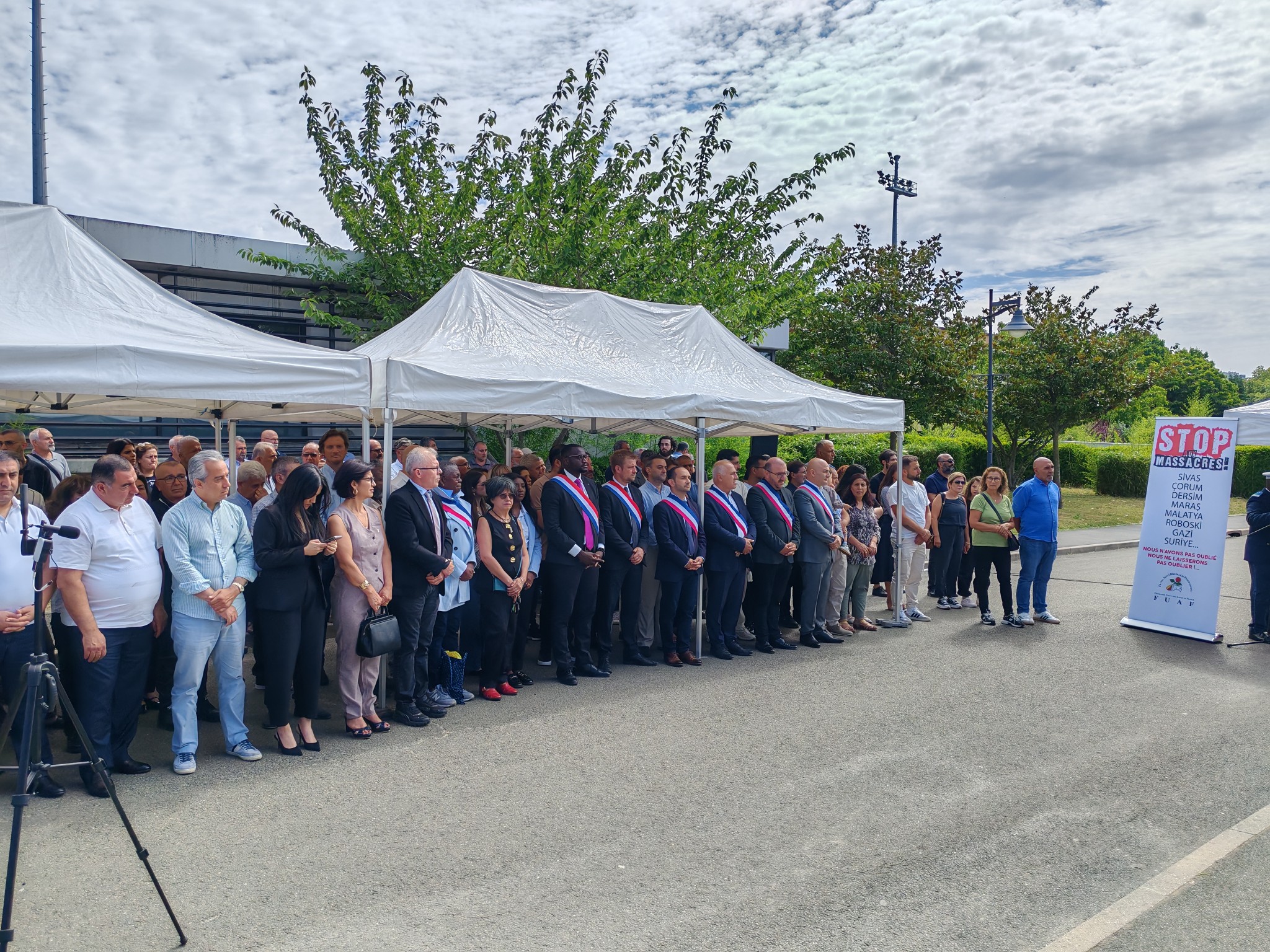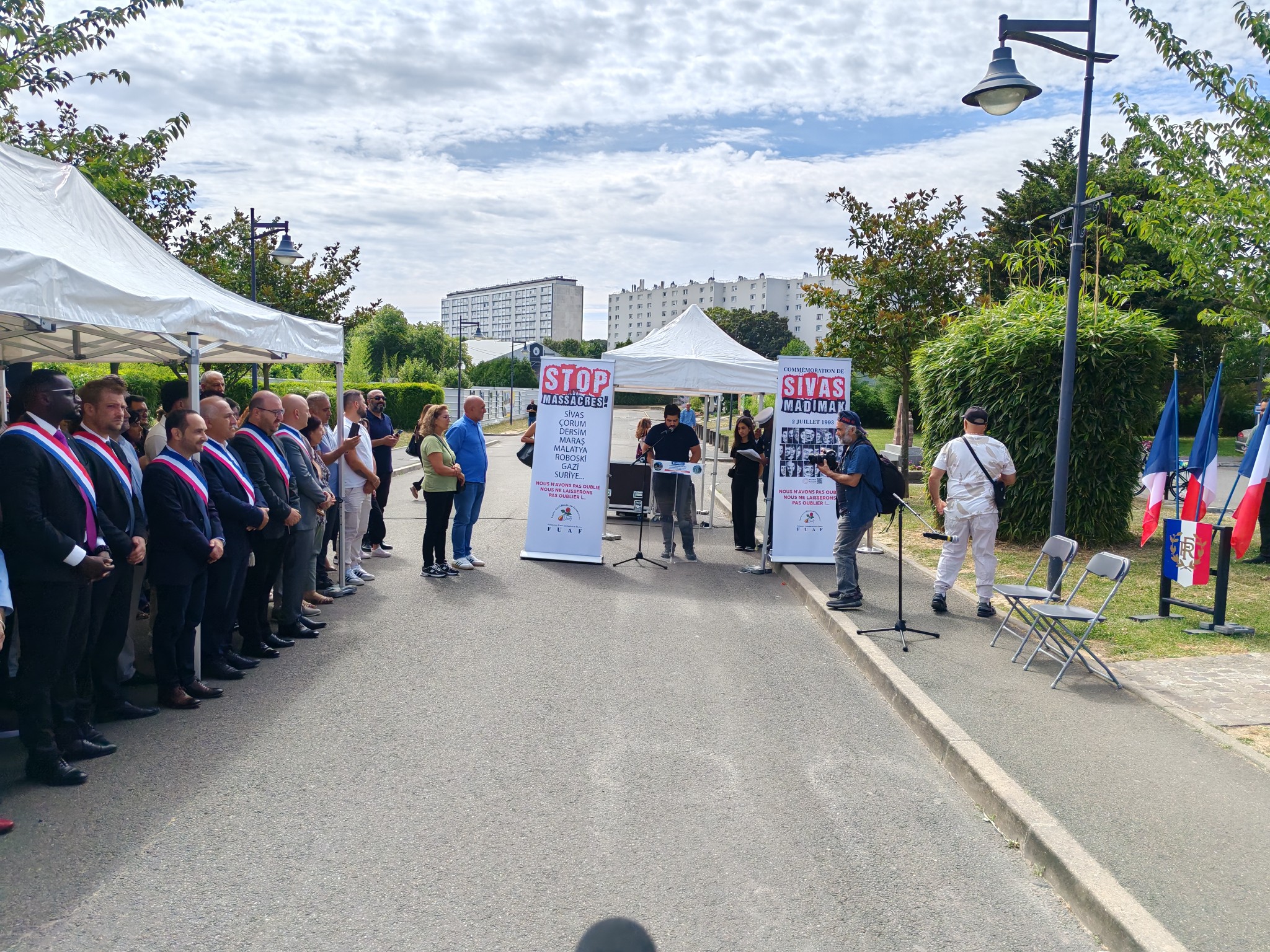 Törenin sunumunu Thierry Clovis üstlendi. Gençler Hasan Kucun ve Sehriban Erdoğan, anıtta yer alan metni okudu. Törende söz alan Val d’Oise milletvekilleri Carlos Martens Bilongo ve Romain Eskenazi ile Sarcelles Belediye Başkanı Patrick Haddad ve Meclis Üyesi Maïmouna Camara, Türkiye’deki baskıcı uygulamaları kınadı ve Alevi halkıyla dayanışma içinde olacaklarını ifade etti.
