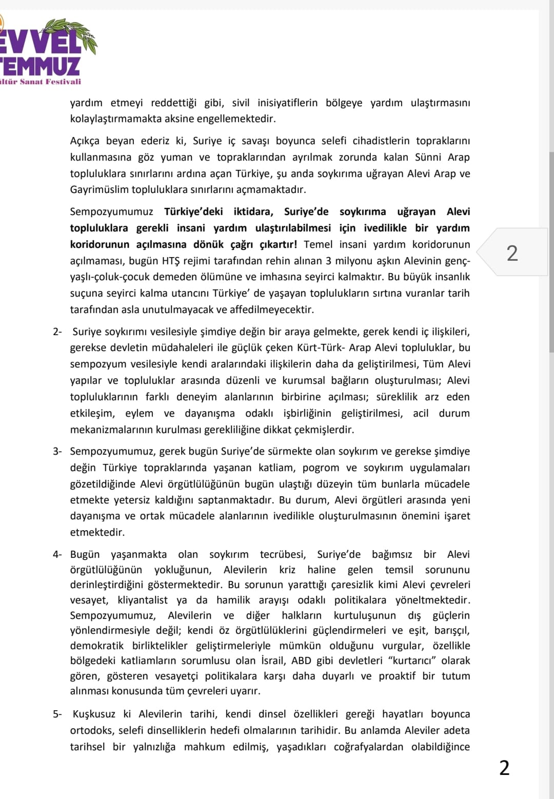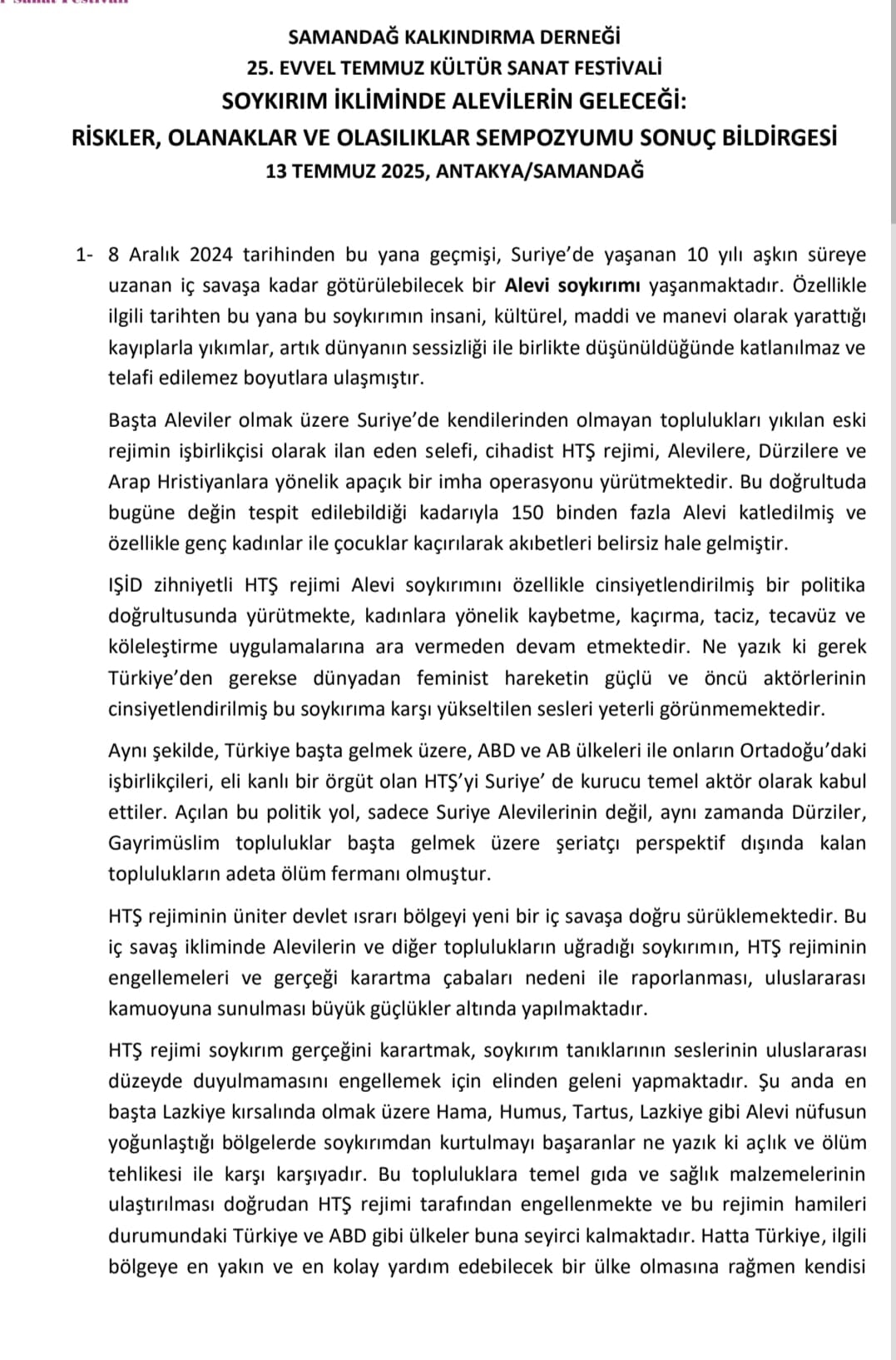 8 Aralık 2024’ten bu yana Suriye’de yaşanan gelişmelerin Alevi soykırımı olarak tanımlandığı bildirgede, insanî, kültürel ve maddi kayıpların boyutuna dikkat çekildi. Başta Aleviler olmak üzere Dürziler ve Arap Hristiyanlara karşı yürütülen imha operasyonlarında şimdiye dek 150 binden fazla Alevinin katledildiği ve çok sayıda kadının kaçırıldığı vurgulandı.