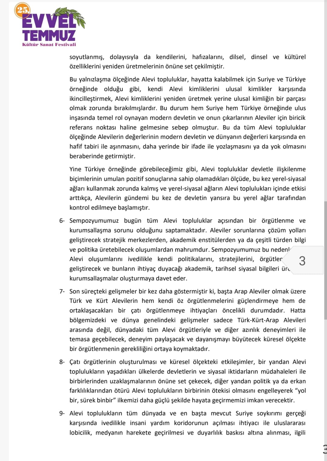 Alevi toplulukların, Suriye ve Türkiye’de devletçi baskılar nedeniyle kendi kimliklerini ulusal kimlikler karşısında yeniden üretmek zorunda kaldığı belirtilen bildirgede, modern devletin referans çerçevesiyle uyumsuz Alevi değerlerinin marjinalleştirildiği ifade edildi.